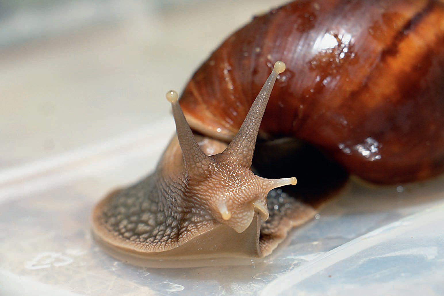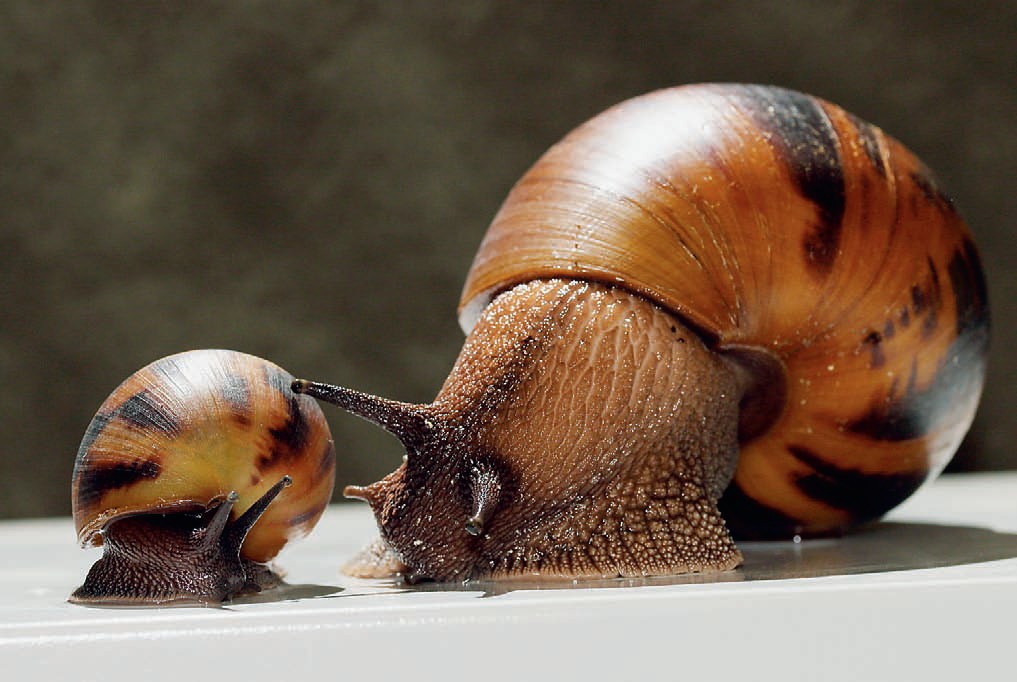 Ни одно другое домашнее животное не способно к таким превращениям, как сухопутные улитки. Из раковины сначала выходит складочка мягкого нежного тела, которая разглаживается и словно наполняется воздухом. Вскоре начинает появляться морщинистая голова, улитка расправляет ногу, прилипает к поверхности и принимается её исследовать. В этот момент из головы, словно раздвижные антенны, вытягиваются рожки. У большинства улиток голова оснащена двумя парами рожек: на верхних длинных и подвижных есть глаза, нижние выполняют функцию осязательного органа и помогают улитке определить фактуру и форму окружающих предметов.