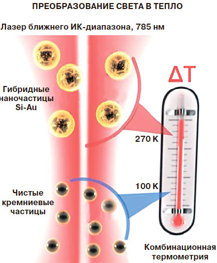 Наночастицы из кремния могут выступать в качестве агентов для фотогипертермии при лечении опухолей. Наночастицы помещают в область, где расположена злокачест-венная опухоль, и облучают светом в окне прозрачности биологической ткани (ближний ИК-диапазон). Поглощая инфракрасное излучение, наночастицы нагреваются сами и нагревают окружающие ткани. При температуре выше 42°С опухоль разрушается, в то время как здоровая ткань без наночастиц остаётся целой. Однако кремний недостаточно хорошо нагревается в ближнем ИК-диапазоне из-за слабого поглощения излучения. Увеличить эффективность нагрева можно либо повысив концентрацию наночастиц, что плохо для биосовместимости и биодеградируемости, либо модифицировав их благородными металлами, например золотом, — тогда за счёт плазмонного поглощения нагрев будет больше.