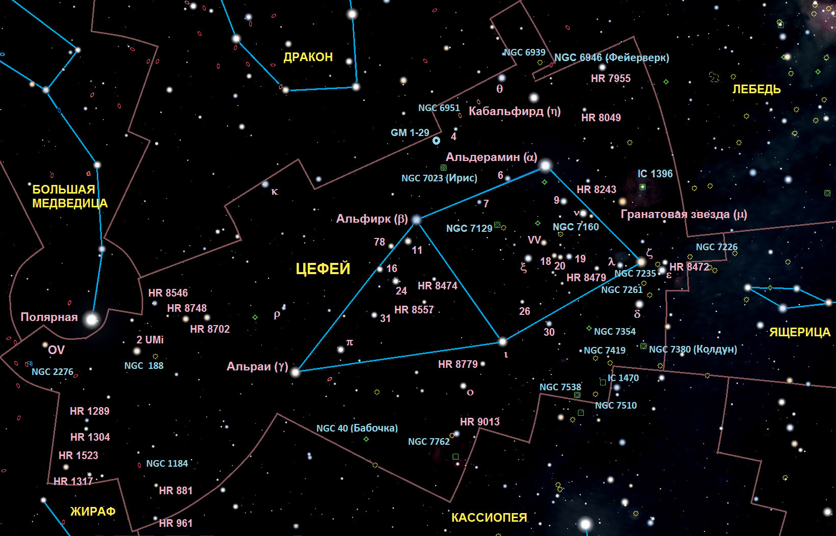 Созвездие Цефея находится чуть в стороне от полосы Млечного Пути, захватывающей меньшую его часть, и содержит несколько интересных звёздных скоплений и туманностей.