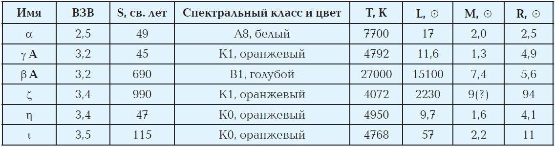 Характеристики самых ярких звёзд (для кратных систем — главных звёзд) созвездия Цефея (ВЗВ — видимая звёздная величина, S — расстояние до Земли, Т — температура, L, M, R — светимость, масса и радиус в солнечных единицах)