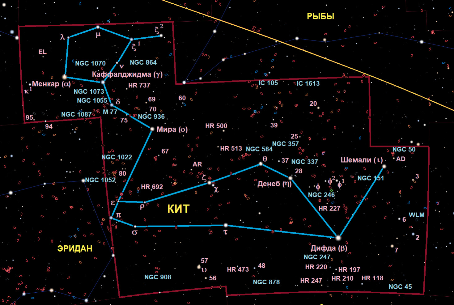 Этой осенью мы завершаем разговор о созвездиях семейства Персея*, названия которых связаны с этим мифологическим героем. Сейчас речь пойдёт о Ките — посланном Посейдоном монстре, которого Персей победил, освобождая Андромеду. Древние греки словом ketos (κῆτος, на латыни cetus) называли не привычных нам китов, а морских чудовищ, близких к драконам. Вероятно, первые мореплаватели, встретившие кита в океане, приняли его за такого мифического зверя. Созвездие Кит известно с древности и входит в число 48 созвездий, перечисленных астрономом II века Птолемеем в «Альмагесте». Правда, лежит оно на небе чуть в стороне, отделённое от остальной группы зодиакальными созвездиями. Здесь расположена область неба, которую в шутку называют водной, поскольку в ней собрались созвездия, названия которых связаны с водой: Рыбы, Кит, Эридан, Южная Рыба, Водолей и Дельфин. Созвездие Кит не содержит очень ярких звёзд, зато в нём находятся две знаменитые звезды: Мира и Тау Кита. Первая известна благодаря необычному поведению, а вторая — благодаря фантастике и поиску внеземных цивилизаций.