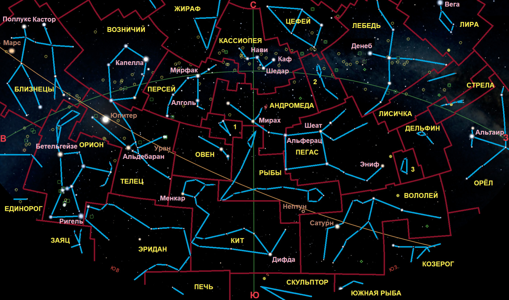 * См. статьи А. Понятова «Время Кассиопеи. Осеннее небо», № 9, 2020 г.; «Время Андромеды. Осеннее небо», № 9, 2021 г.; «Время Цефея. Летнее небо», № 6, 2022 г.; «Время Персея. Осеннее небо», № 9, 2022 г.; «Время Пегаса. Осеннее небо», № 9, 2023 г.