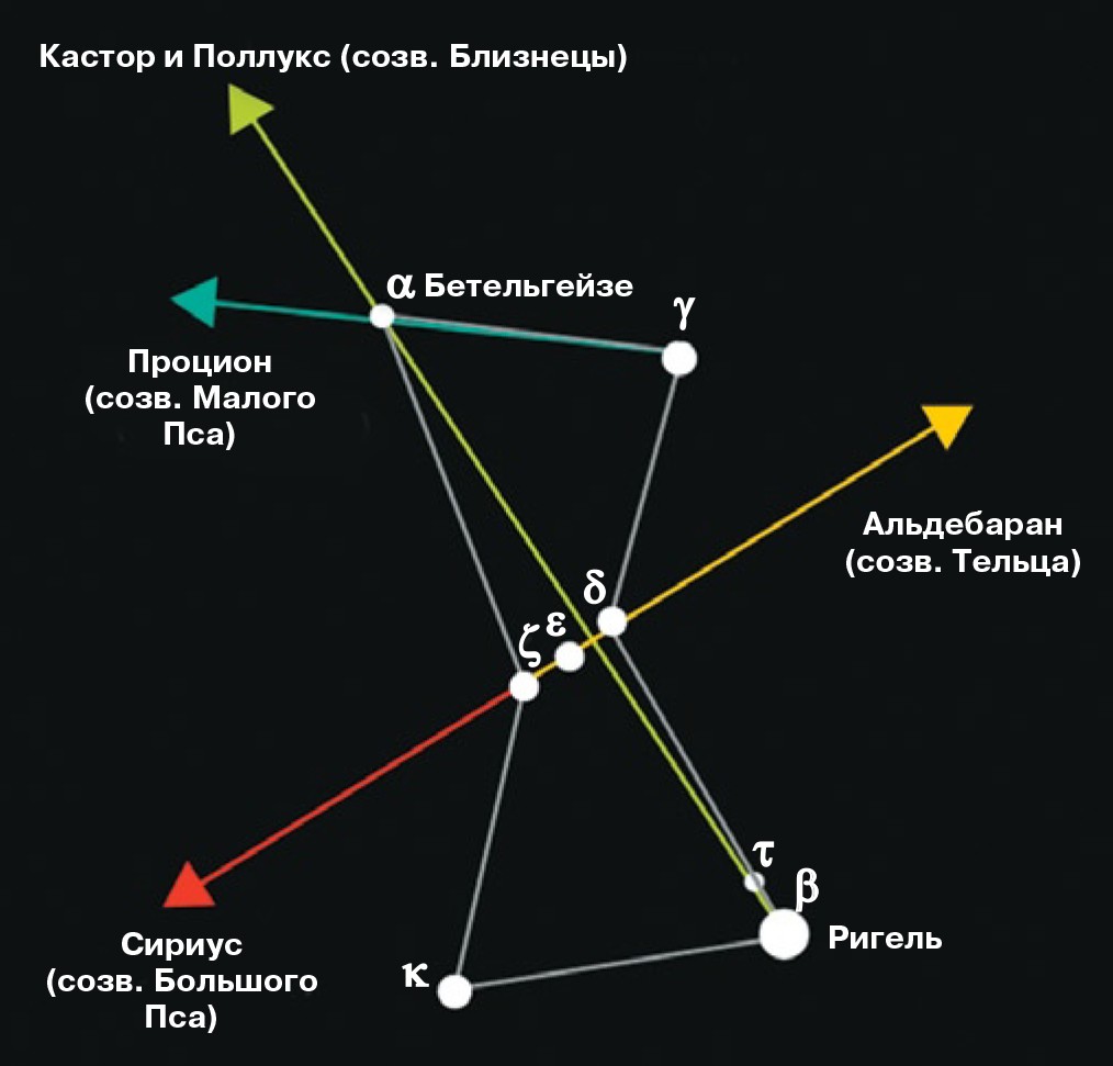 Узнаваемость созвездию придаёт фигура, образованная восемью самыми яркими звёздами, напоминающая песочные часы или сноп. Среди них две звезды нулевой звёздной величины и пять звёзд второй величины. Древние видели в ней фигуру человека: греки — героя многих мифов охотника-гиганта Ориона, арабы — великана, египтяне — бога Саха, а вавилоняне называли его Небесным пастухом: Бетельгейзе (α Ori, 0,2—1,2m) и Беллатрикс (γ Ori, 1,64m) — плечи охотника, а Ригель (β Ori, 0,12m) и Саиф (κ Ori, 2,07m) — его ноги. Кстати, название Бетельгейзе и происходит от словосочетания, которое переводится с арабского как «рука близнеца», а Ригель — «нога». Три яркие звезды Альнилам (ε Ori, 1,69m), Альнитак (ζ Ori, 1,74m) и Минтака (δ Ori, 2,25m) в узкой, «перетянутой» части фигуры образуют астеризм пояс Ориона. Более слабая звезда Меисса (λ Ori, 3,66m) соответствует голове Ориона.