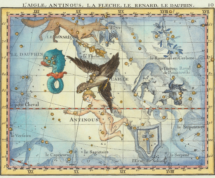 Как Орёл созвездие описано и в каталоге звёздного неба «Альмагест» астронома II века Клавдия Птолемея. Правда, у него оно было меньше, чем сейчас. Часть нынешних южных звёзд созвездия (δ, η, θ, ι, κ, λ) Птолемей описывает как «звёзды около Орла, которым присвоено имя Антиной». Это одна из попыток поместить на небо не героя мифов, а реального человека. Антиной был возлюбленным римского императора Адриана, который в 130 году в 20 лет умер при загадочных обстоятельствах во время путешествия по Нилу. Скорбящий император обожествил своего любимца, организовал его культ, основал в Египте город Антинополис недалеко от места смерти юноши и даже в 132 году поместил его на небо, назвав именем Антиноя астеризм. Неизвестно, причастен ли к этому сам Птолемей, который наверняка знал, что вавилонский Орёл держал в когтях созвездие, называемое Мертвецом. Впоследствии астрономы Римской империи, а позднее некоторые астрономы Нового времени, включая Тихо Браге, Яна Гевелия и Иоганна Боде, выделяли этот астеризм в отдельное созвездие. Окончательно вопрос решил Международный астрономический союз: в 1922 году при разработке современных 88 созвездий он включил звёзды Антиноя в созвездие Орёл. Завершением истории стало решение Рабочей группы МАС по названиям звёзд, которая одобрила в 2024 году название Антиной для звезды θ Aql в честь устаревшего созвездия.