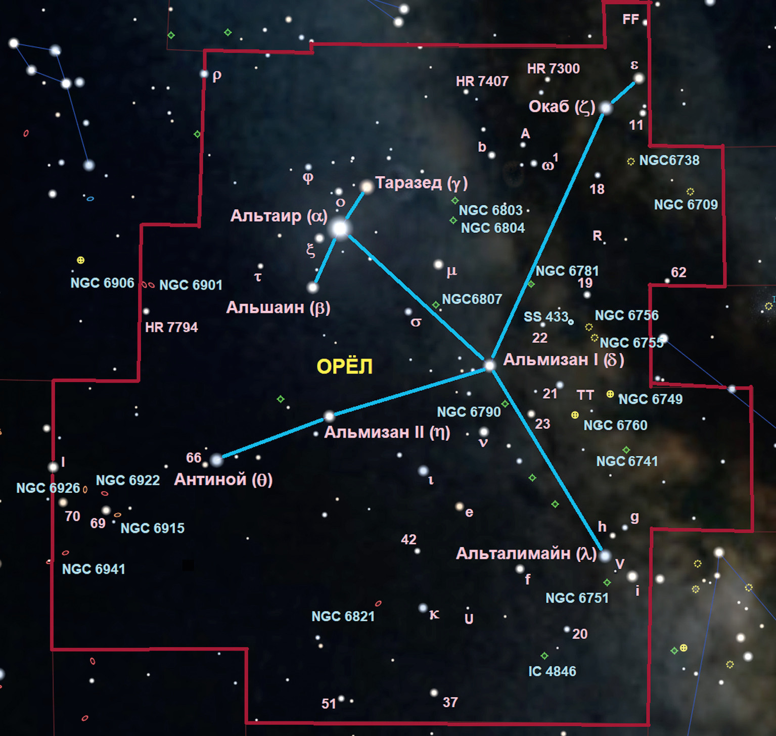 Орёл (на латыни Aquila, сокращение: Aql) — достаточно крупное экваториальное созвездие, расположенное выше эклиптики вдоль Млечного Пути. Оно занимает 22-е место по площади среди 88 современных созвездий и, имея 70 звёзд ярче 6m, делит 28—31-е места с Близнецами и Львом по их количеству. Характерное крестоподобное расположение главных звёзд созвездия с древности ассоциировалось с птицей. Своё название — Орёл — созвездие получило ещё пять тысячелетий назад в шумерской, а затем вавилонской астрономии. В индуизме оно отождествляется с божеством Гарудой — орлоподобной птицей, а позднее полуорлом-получеловеком. А у древних египтян оно, предположительно, считалось соколом бога Гора.