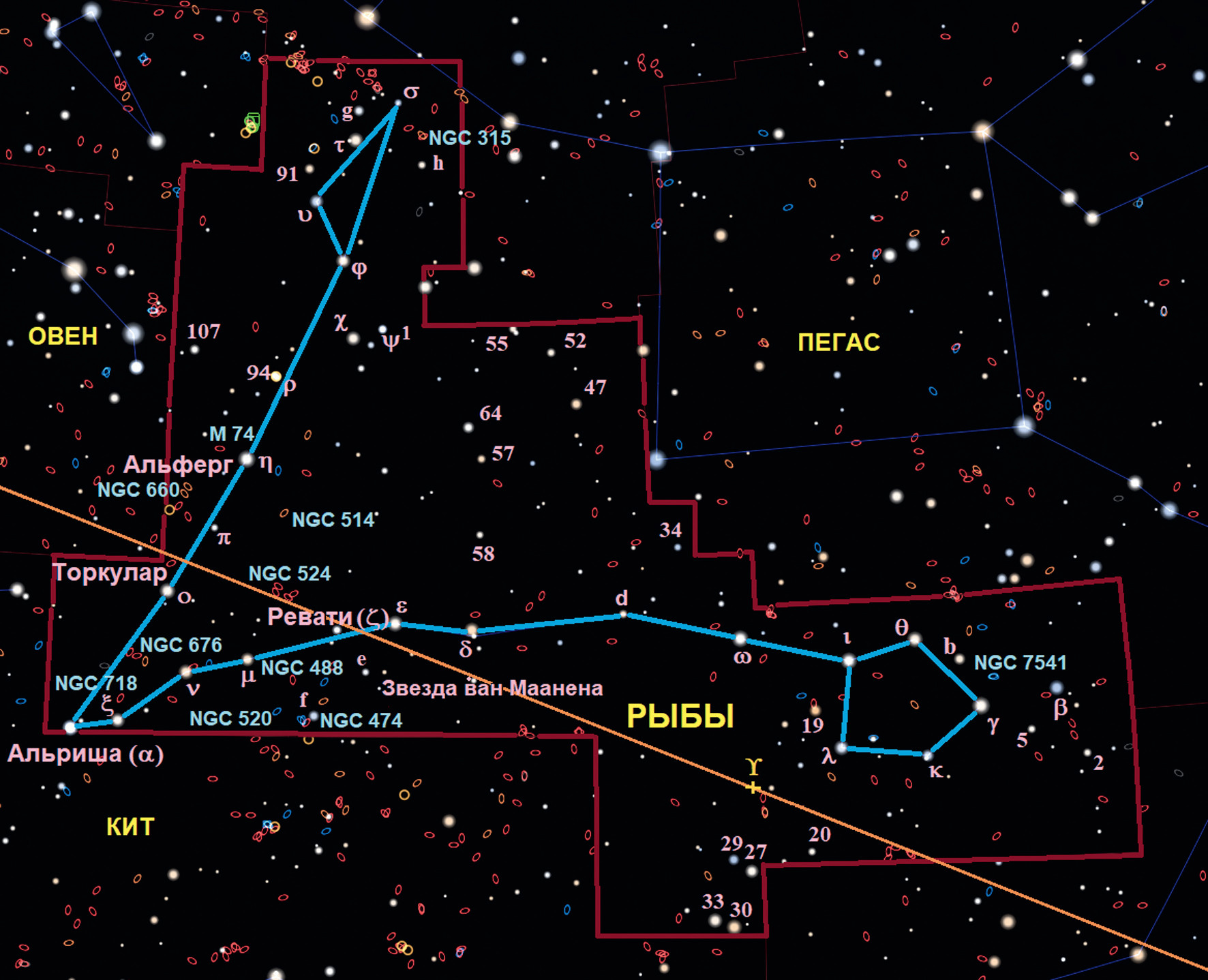 Стараниями древних и более поздних астрономов Рыбы расположились в области неба, которую в шутку называют «водной», поскольку в ней собрались созвездия, названия которых связаны с водой: Рыбы, Кит, Эридан, Южная Рыба, Водолей, Дельфин и… Козерог. Да-да, Козерогом со времён Древнего Вавилона называли морского козла — водное мифическое существо, описываемое как наполовину козёл, наполовину рыба. А ещё Малый Конь был сотворён богом морей Посейдоном. Античные представления о связи с Рыбами воды оказались настолько живучи, что уже в Средневековье схождение планет в созвездии Рыбы в 1524 году вызвало всеобщую панику, особенно среди протестантов, поскольку считалось, что это предвещает новый всемирный потоп.