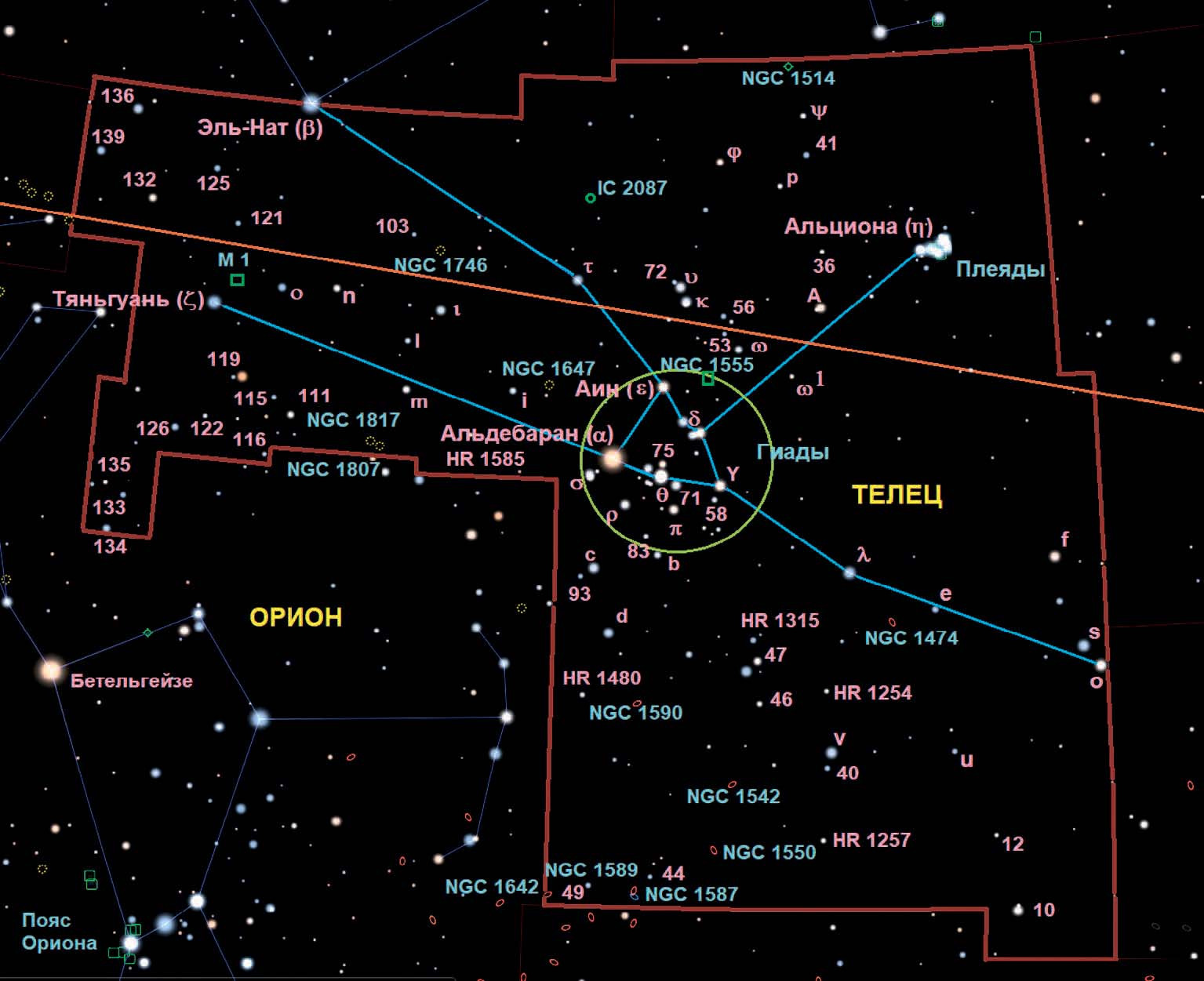 Телец (на латыни Taurus, сокращение Tau) — крупное зодиакальное созвездие, по площади занимающее 17-е место из 88 известных созвездий. По числу же звёзд, видимых невооружённым глазом (125 звёзд ярче 6m), оно делит 6—7-е места с Большой Медведицей. А вот по количеству звёзд в списке 300 ярчайших на земном небе (7 штук) оно немного отстаёт и делит с другими созвездиями лишь 14—21-е места.