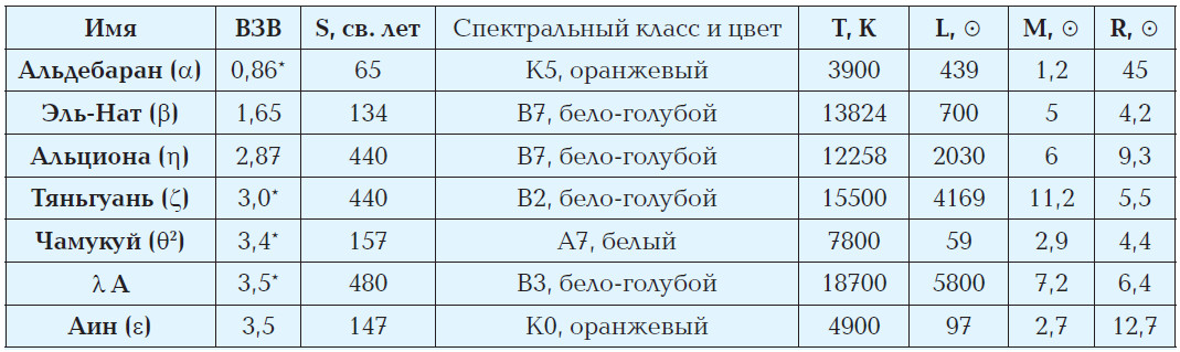 Характеристики самых ярких звёзд (для кратных систем — главных звёзд) созвездия Телец