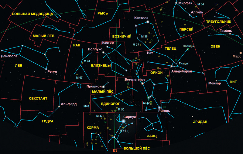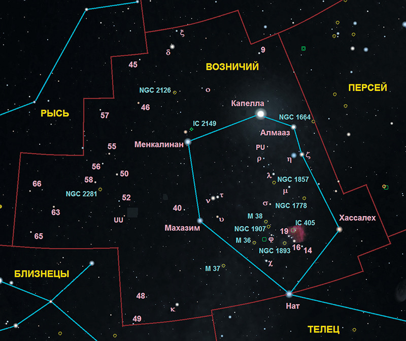 Вот и наступила зима. К зениту поднялось созвездие Возничего, позволяя рассмотреть себя во всей красе. Пусть оно и уступает блистательному Ориону, но и в нём много достопримечательностей Млечного Пути. Это и загадки красавицы Капеллы, и одна из самых странных звёзд земного неба — эпсилон Возничего, звёздные скопления и туманности и даже уникальная система из четырёх скоплений взаимодействующих галактик.