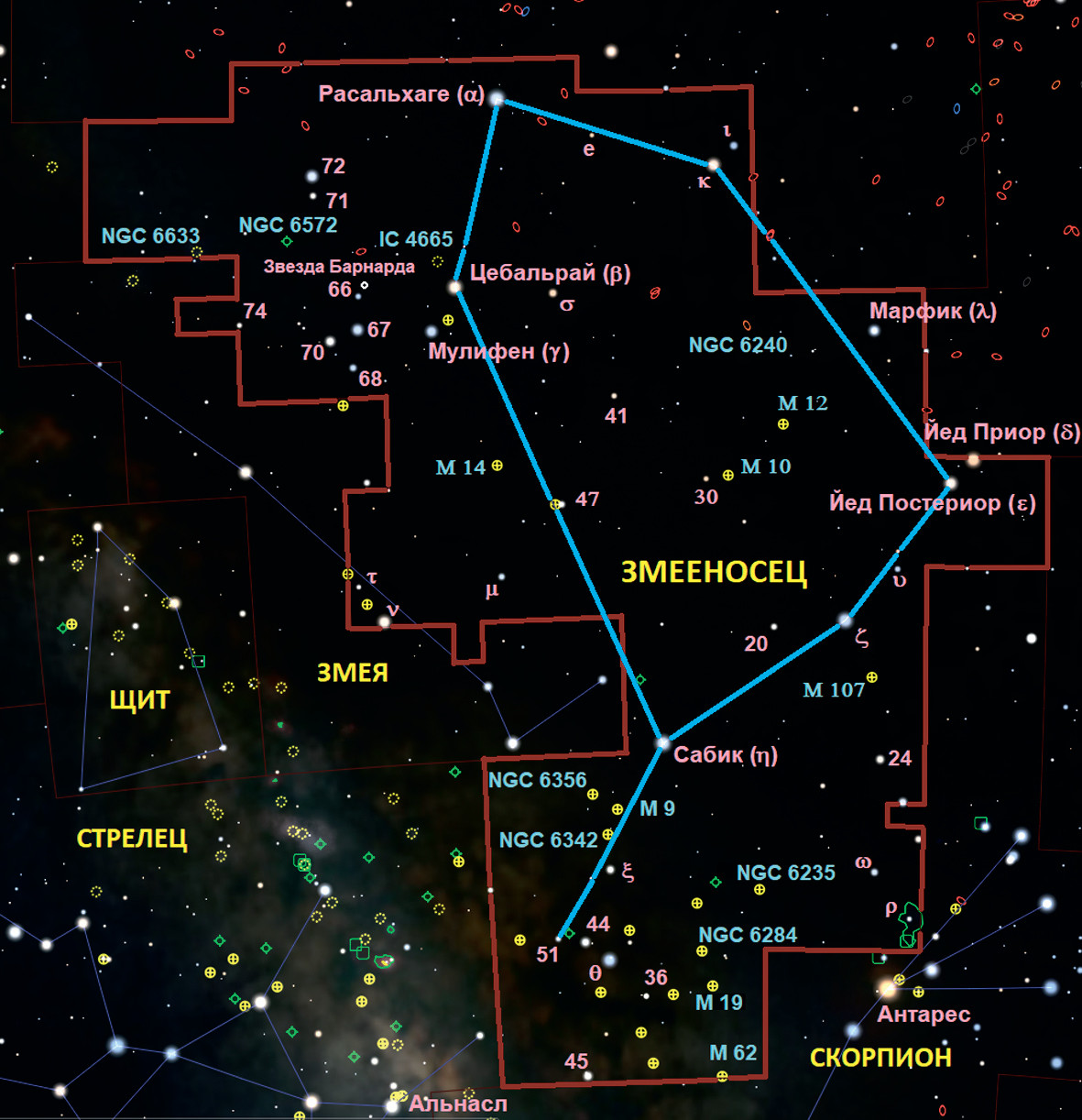 Змееносец (на латыни Ophiuchus, сокращение: Oph) — крупное экваториальное созвездие, пересекающее эклиптику. Оно занимает 11-е место среди 88 современных созвездий по площади и, имея 100 звёзд ярче 6m, делит 12—17-е места с такими известными созвездиями, как Андромеда и Скорпион, которые, впрочем, значительно меньше его по размеру. Змееносец не содержит очень ярких звёзд, но пять звёзд со звёздной величиной выше 3m и ещё восемь выше 4m не дают ему затеряться на небе. Из них девять звёзд входят в число 300 самых ярких на небе. Созвездие известно с древности и описано в каталоге звёздного неба Клавдия Птолемея «Альмагест».