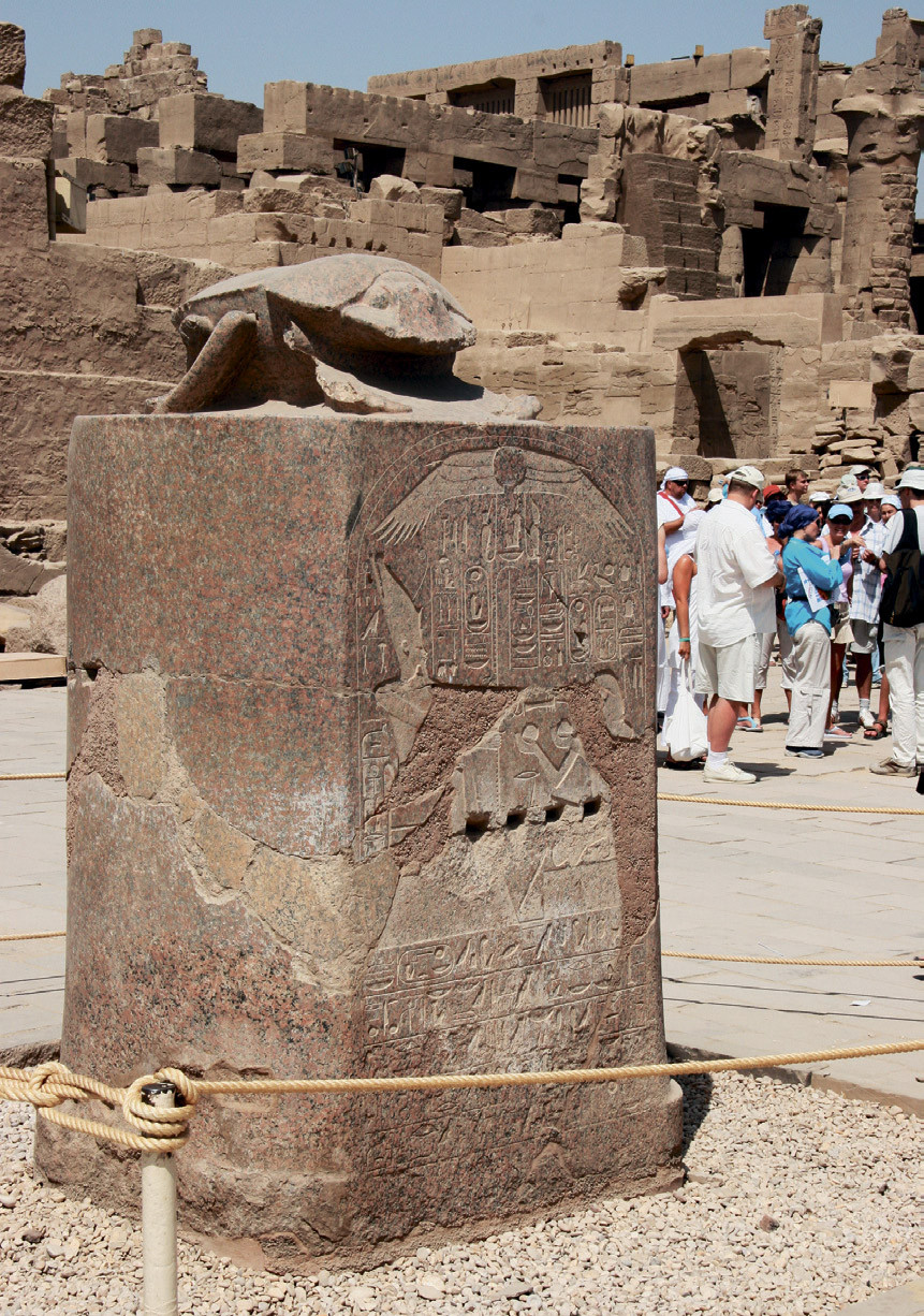 Гранитная статуя священного скарабея в Карнакском храме (Луксор, Египет) создана во время правления фараона Аменхотепа III. Возведена в честь Хепри-Атум-Ра, который был богом творения, олицетворял силу воскресения Солнца, новую жизнь. Египтяне считали, что скарабей размножается сам по себе, а значит наделён божественной созидательной силой.