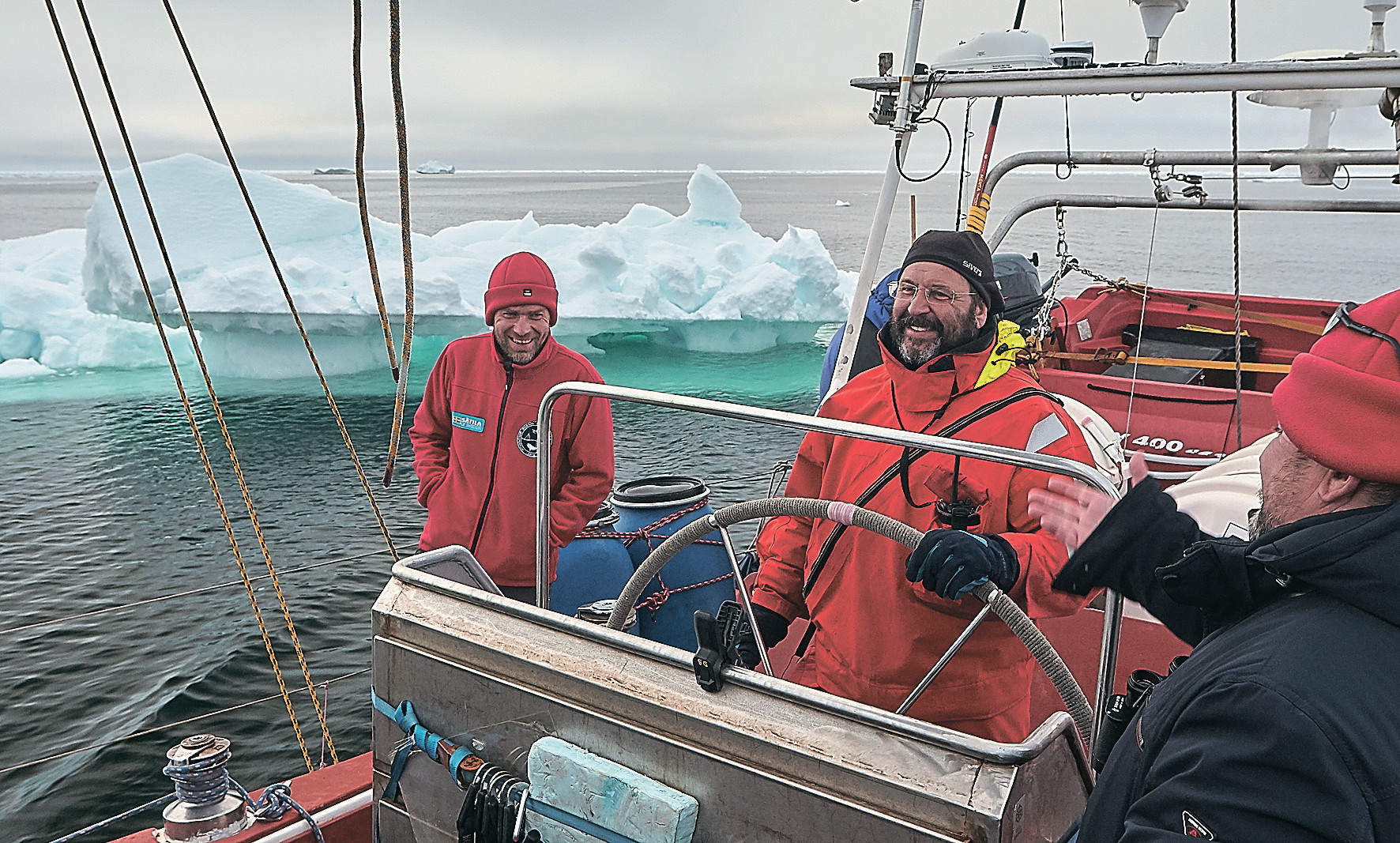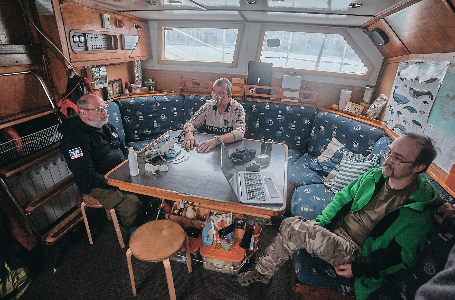 Рядом с кают-компанией располагается небольшой камбуз, оснащённый всеми атрибутами современной городской кухни, а также опреснителем морской воды. Что касается «удобств», то на яхте аж три гальюна с умывальниками и в придачу такой желанный в долгих путешествиях горячий душ! Благодаря отопительному котлу на борту внутри яхты ходишь в футболке. И это в Арктике! В отдельном отсеке сушатся промокшая обувь и одежда всей команды. К слову сказать, подобным наличием «звёзд» (в гостиничной терминологии) может похвастаться далеко не любая яхта, тем более арктического класса. Совладельцы «Alter Ego» и организаторы экспедиции приложили значительные усилия для того, чтобы максимально облегчить трудности длительных морских переходов всем участникам экспедиций.