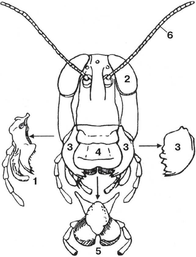 Умение насекомых добывать и перерабатывать пищу в большой степени зависит от устройства их ротового аппарата и пищеварительной системы. Пищеварительную систему — будь то позвоночные или беспозвоночные — схематически можно представить в виде трубки, открытой с двух сторон. Передний конец — это рот. Попав в него, пищевой комок движется по трубке, где постепенно расщепляется различными ферментами; продукты распада всасываются в тело, а непереваренные остатки выбрасываются наружу из заднего конца. Но чтобы пища попала в рот, нужен специальный ротовой аппарат. У позвоночных эволюция «придумала» мускулистые губы, зубы, язык. Беспозвоночные устроены совершенно иначе. Насекомые и другие членистоногие откусывают и запихивают пищу в рот сильно видоизменёнными конечностями (люди тоже иногда едят руками — так вкуснее). Ротовой аппарат образовался у них из придатков нескольких слившихся сегментов тела. Традиционно его частям дали названия, соответствующие нашему ротовому аппарату, но это не более чем антропоморфизм — приписывание человеческих черт нечеловеческим существам.