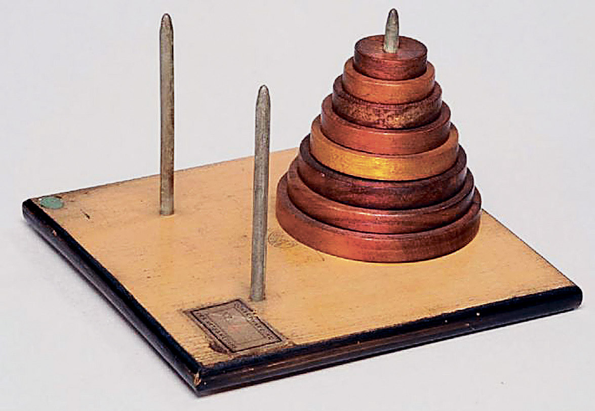 Настольная головоломка, которую называют «Ханойская башня», заключается в следующем. Необходимо восемь дисков, размещённых на одном из трёх стержней в порядке увеличения их размеров (сверху вниз), переложить на второй стержень, используя третий стержень как вспомогательный и соблюдая следующий правила:
