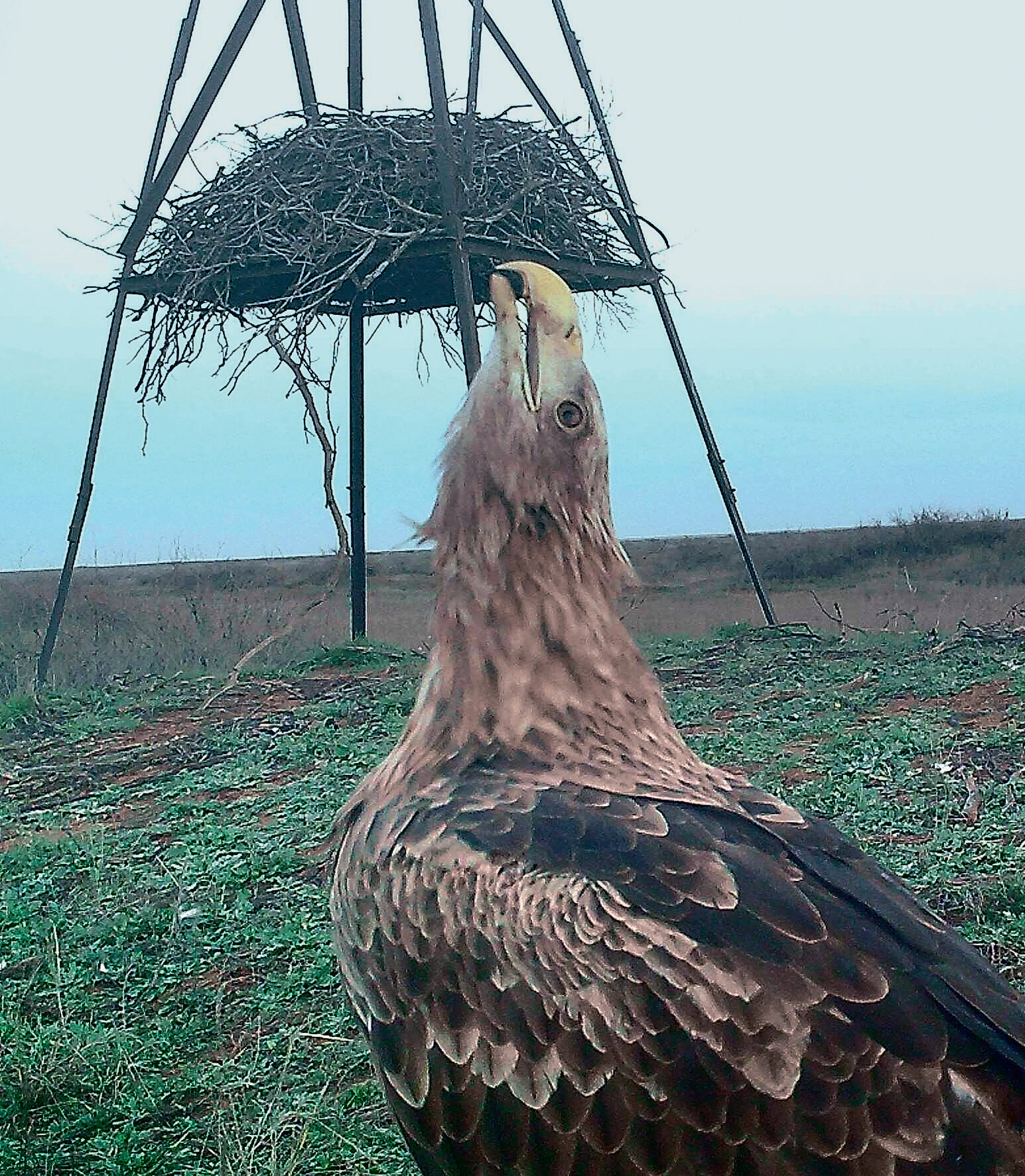 Сотрудники заповедника «Чёрные земли» (Республика Калмыкия) обнаружили необычные гнёзда орлана-белохвоста. Одно из них было на геодезическом знаке, где до недавних пор гнездились курганники, а сейчас на нём вдруг обосновались белохвосты: в гнезде, оставшемся от курганников, лежало два орланьих яйца. Другое гнездо сотрудники заповедника заметили на обесточенной опоре ЛЭП: это опять было бывшее гнездо курганников, только теперь в нём насиживала кладку самка орлана.