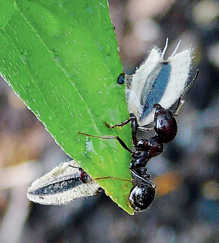 Семена травянистых растений, растущих в тени лесного полога, в большинстве своём разносятся муравьями, для привлечения которых на семенах образуются специальные богатые белками и маслами придатки. Насекомое отгрызает лакомый кусочек, а остальную часть выбрасывает. В европейской фауне помощью шестиногих сеятелей пользуются порядка тысячи растений. Среди них различные фиалки, осоки, васильки, лапчатки, копытники, первоцветы, молочаи, чистотел. К примеру, душистая фиалка (Viola odorata) иначе как муравьями не распространяется.