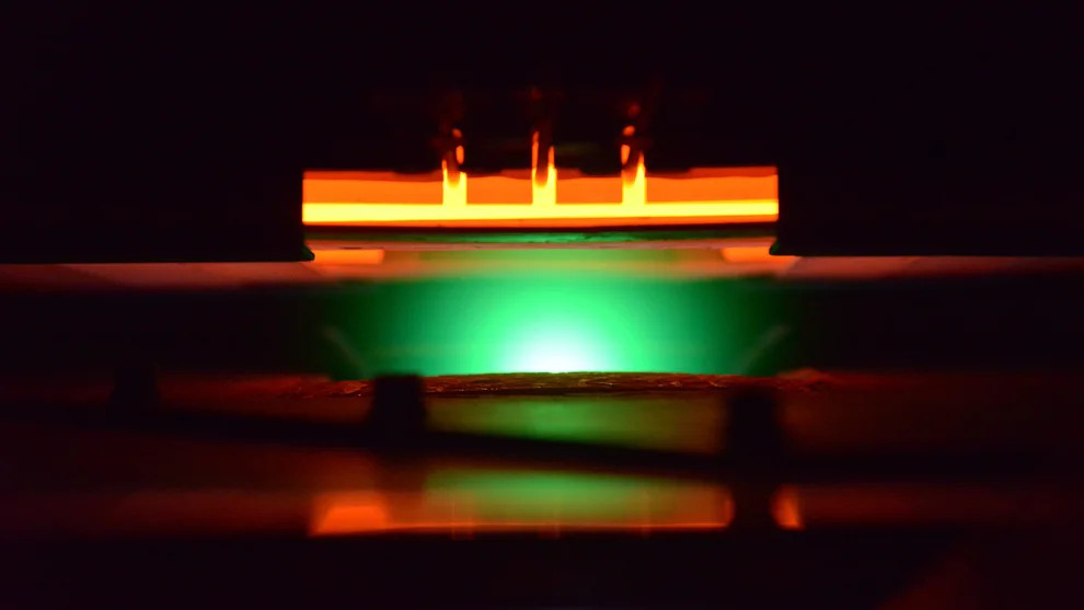 Процесс лазерного осаждения слоя сверхпроводника на металлическую ленту проходит в вакууме при температуре около 800 градусов. Фото: предоставлено компанией «С-Инновации»