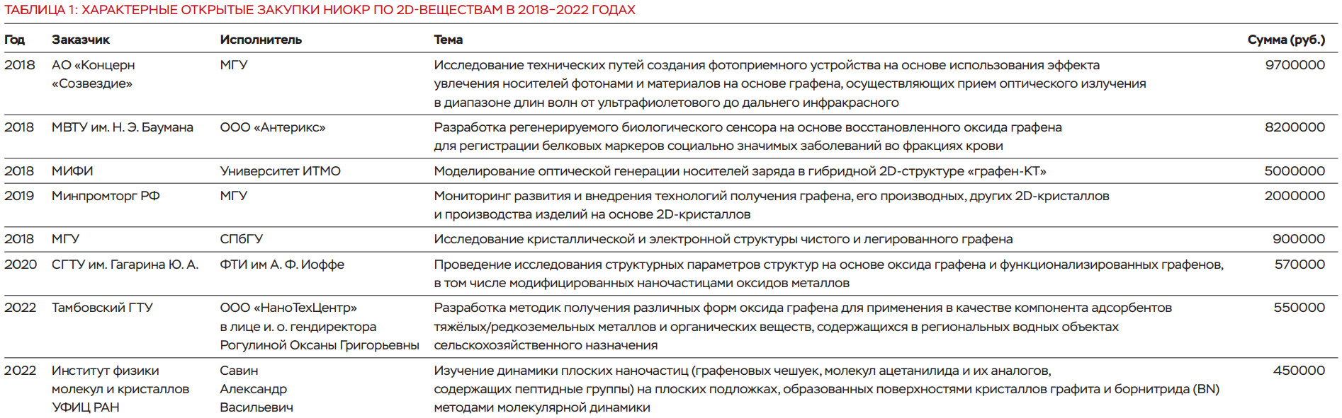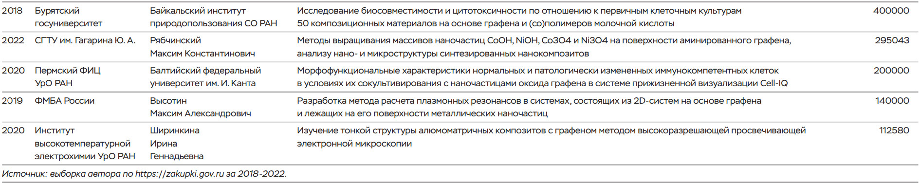 Портал https://zakupki.gov.ru даёт возможность оценить стоимость НИОКР в области графена и подобных материалов. За пять лет было проведено около 100 открытых торгов. Характерные случаи представлены в таблице 1.