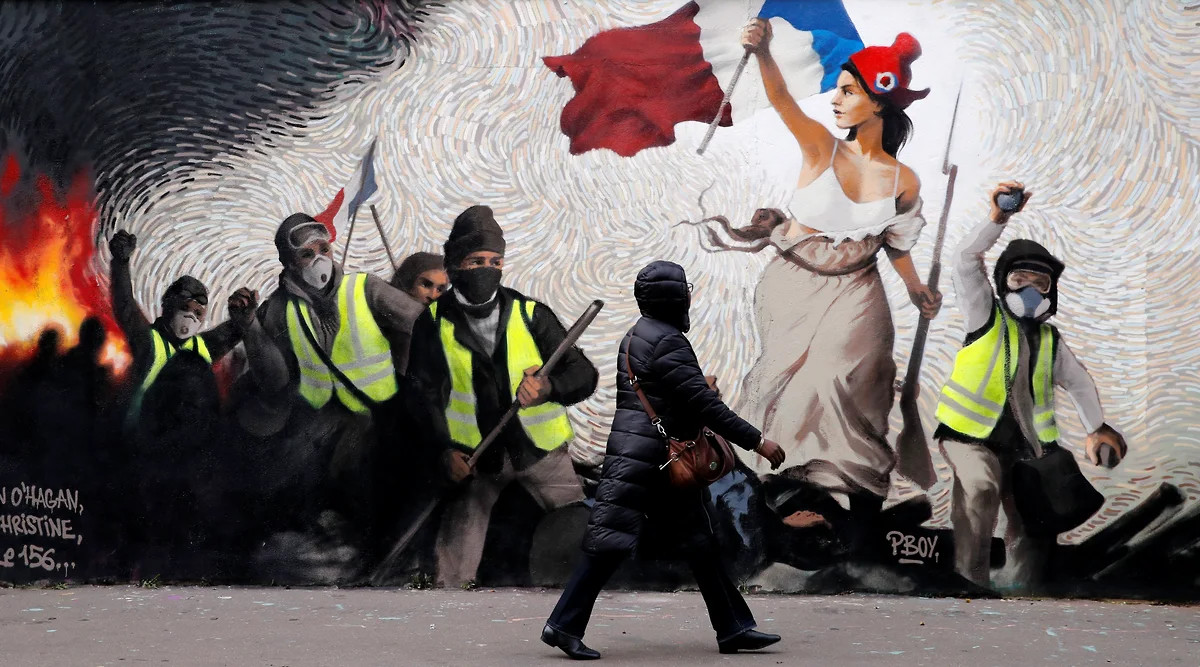 Уличная фреска в Париже: протес­тующие «желтые жилеты» и «Свобода, ведущая народ» Эжена Делакруа (в отличие от ори­гинала, с прикрытой грудью). Фото: Christophe ENA / AP