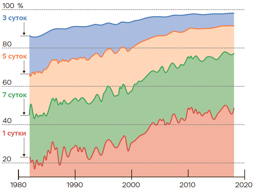 Краткосрочный прогноз погоды достиг высокой точности. Оправдываемость прогноза на трое суток вперед составляет 95–97% в отношении атмосферного давления. Наиболее быстрые и производительные суперкомпьютеры мира используются именно для прогноза погоды и климатического моделирования. Рост точности прогноза связан также с постоянным развитием системы метеонаблюдений.