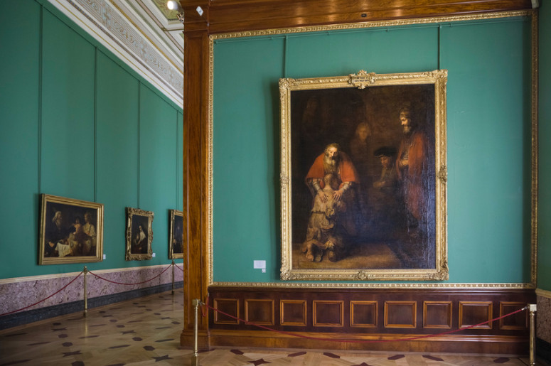 В западной части у перехода в Большой Эрмитаж находится зал, в котором представлены работы художника золотого века голландской живописи Рембрандта Харменса ван Рейна. Рембрандта называли мастером светотени — обратите внимание, как у художника выстроена композиция, прописаны освещенные участки и скомбинированы холодные и теплые оттенки. Среди полотен в этом зале — одна из самых известных его работ: «Возвращение блудного сына», которую художник создал приблизительно в 1668 году за несколько месяцев до смерти. В основу сюжета легла библейская притча о сыне, который промотал свою часть наследства и с раскаянием вернулся в отчий дом. Это самое масштабное полотно Рембрандта на религиозную тему, причем написал он «Возвращение блудного сына» не по заказу. В Эрмитаж картина попала из коллекции герцога Андре д'Ансезена в 1766 году. Тогда Дмитрий Голицын выкупил ее по поручению Екатерины II.
