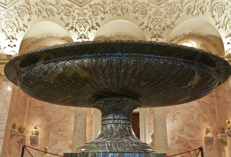 Основу для чаши — монолитный фрагмент — добыли в 1815 году на алтайской каменоломне. Тогда там обнаружили крупную скалу этой породы. Когда Александру I сообщили о такой находке, он повелел вырезать из камня эллипсовидную вазу.