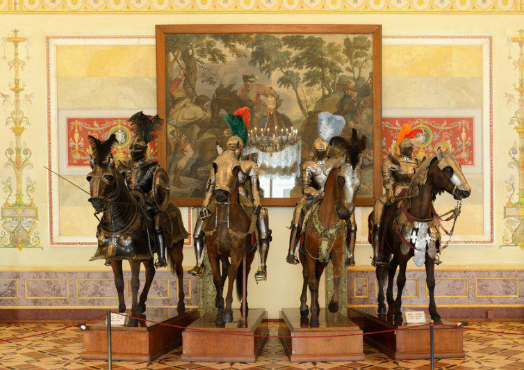 Один из самых масштабных интерьеров Нового Эрмитажа — Рыцарский зал. Здесь разместили коллекцию оружия для турниров, парадного, охотничьего и холодного оружия, рыцарские доспехи. У стены — четыре рыцаря на конях в полном обмундировании. Напротив вооруженной квадриги в витрине можно увидеть шедевр собрания — шлем в виде фантастического существа работы известного в Италии оружейника Филиппо Негроли. Мастер выковал его из одного куска железа — эта техника утрачена уже после XVI века. Шлем принадлежал правителю Урбино герцогу Гвидобальдо. С этим шлемом герцог изображен на фамильном портрете.