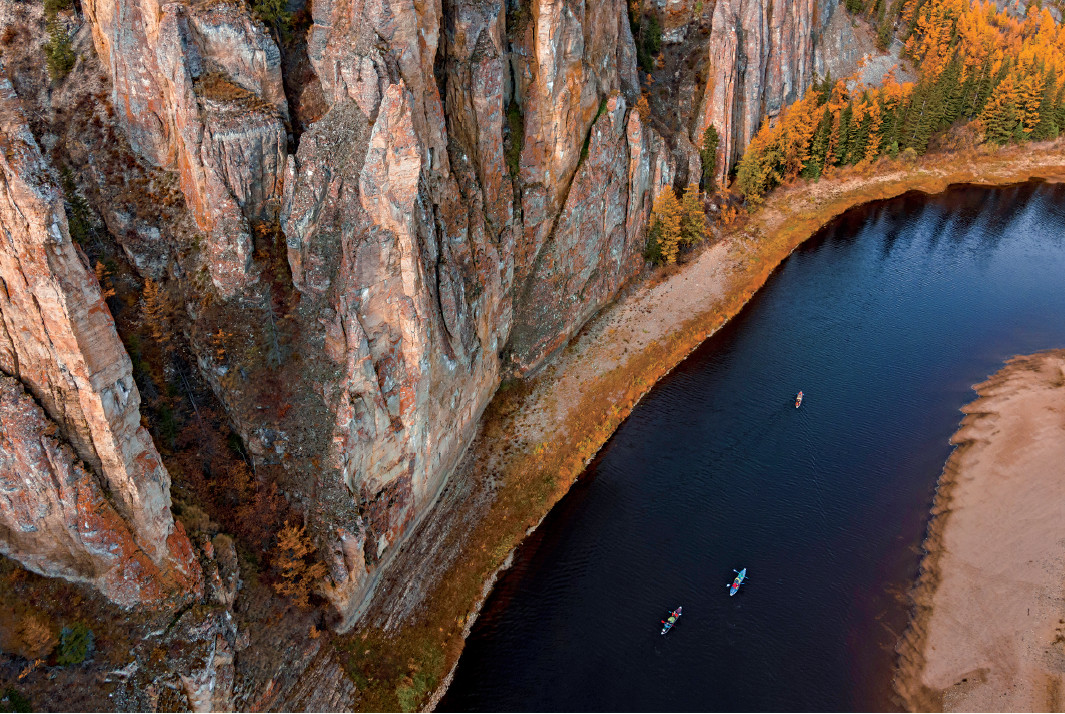 «Этот сплав по реке Синяя в Якутии я снимал с дрона. Река живописно петляет по тайге – то слева по берегам, то справа вырастают скалы-останцы. Впадает река в Лену, примерно в том месте, где находятся знаменитые Ленские столбы. Когда-то здесь был