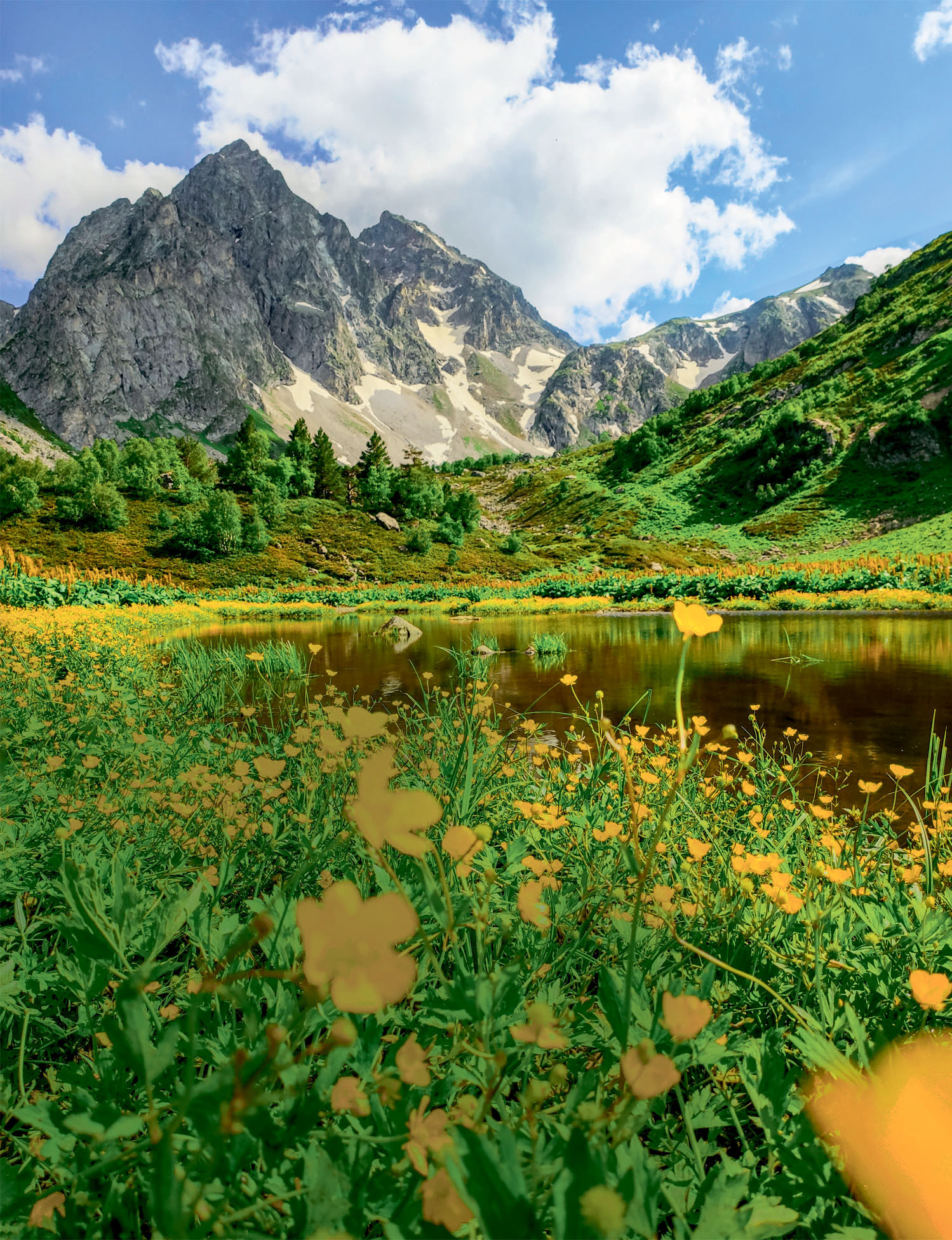 Я оказался здесь не совсем случайно. Архыз – родина моей мамы. Наверное, поэтому для меня тут всё быстро стало родным. Меня сразу пленил красочный южный склон хребта Абишира-Ахуба, который защищает долину Архыза от холодных северных ветров. Это и помогает создать уникальный микроклимат места. Здесь очень комфортно. На южном склоне курорта расположена канатная дорога «Млечный путь». Именно отсюда, с верхней станции канатной дороги на высоте 2 240 м, стартует один из моих любимых маршрутов — «Край озёр». Не самый простой, но очень живописный. Часть пути проходит среди душистых трав альпийского пояса — весной и осенью эти склоны покрываются ковром цветущих крокусов. Преодолев набор высоты в 600 м по пути к перевалу Федосеева (2 880 м), можно встретить мирно пасущихся лошадей. Преодолев крутой подъём, вы попадаете на удивительную панорамную площадку — с одной стороны открывается невероятный вид на Архыз, а в ясную погоду отсюда даже можно увидеть вершины Эльбруса, с другой стороны вам открывается суровое заабиширье — спуск к озеру Турьему, где навсегда очаровываешься этими сдержанными красками, молчаливыми каменными глыбами и изысканными крошечными растениями, пробивающимися сквозь скалы. Спуск к Турьему озеру несложный. Водоём — невероятного голубого цвета. В июне заросли рододендрона покрывают его берег огромными шапками белых цветов.