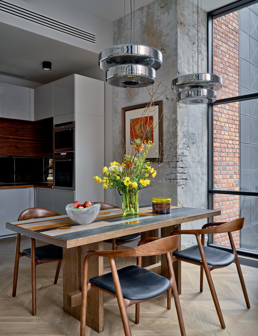 В РАБОТЕ НАД ДИЗАЙНОМ КВАРТИРЫ нам хотелось избежать ощущения «дома с иголочки», лоска современного нового жилья. Поэтому декоративная штукатурка на стенах выполнена с эффектом состаривания. Мебель сделана по эскизам на столярном производстве и выглядит как винтаж. В этом решении есть игра со временем: рисунок столешницы с цветными керамическими элементами, подбор мебели простых геометрических форм, контрастные цвета в декоре — всё это по стилю напоминает работы супрематистов.