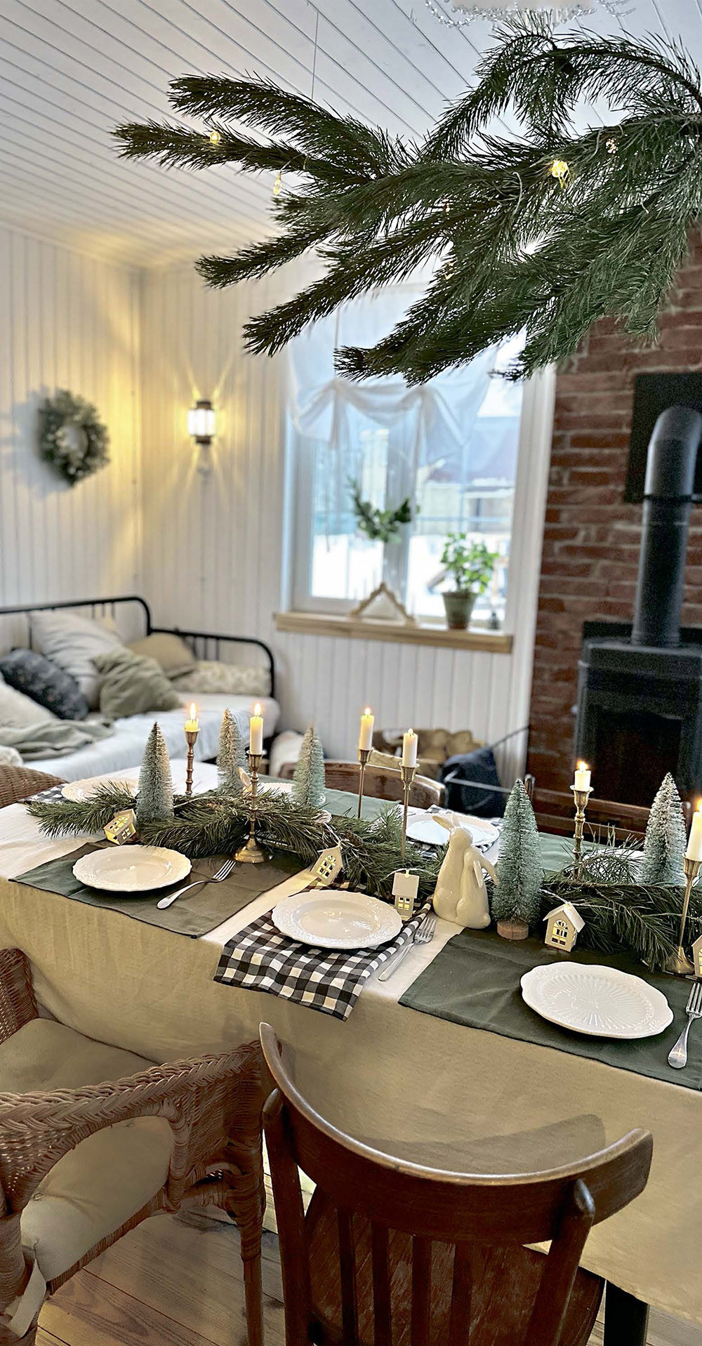 Не представляю себе новогодний декор без зелёного цвета и множества свечей. Над столом мы подвесили ветку сосны и украсили её гирляндой. На скатерти – живые еловые ветви с очаровательными светящимися мини-домиками.