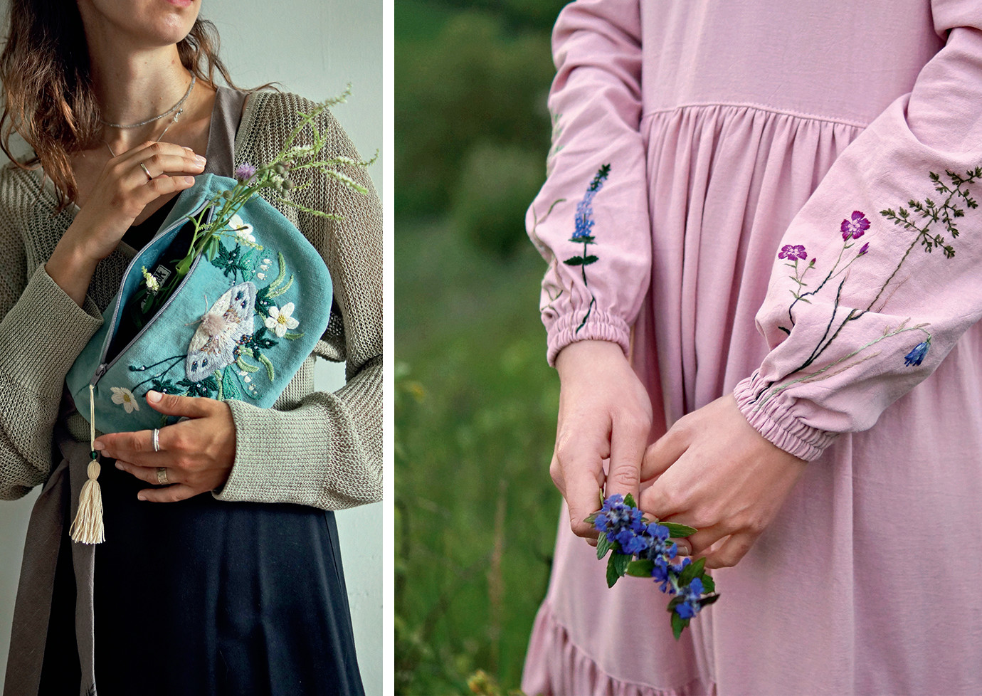 В своих моделях я использую не только ручную вышивку, у меня есть изделия с набойкой штампами и отпечатки растений. Мне нравится комбинировать разные техники. Но в целом стараюсь ориентироваться на актуальные направления. Сейчас тренды в вышивке создают Лиза Смирнова и Карина Кино. У них она выглядит современно и свежо, мне нравится, как они сочетают материалы и цвета.