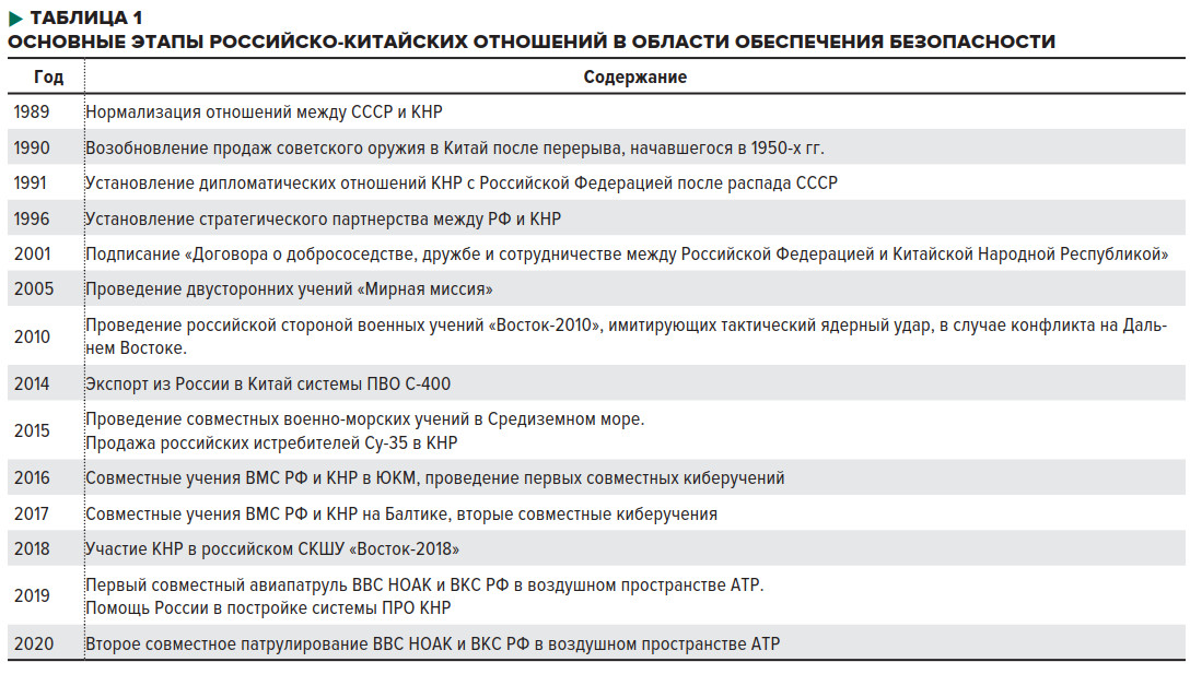 Военное сотрудничество Москвы и Пекина развивалось поступательно. С 1949 по 1969 гг. из СССР Китаю была поставлена военная техника на общую сумму около 4,1 млрд. долл. В период с 1951 по 1960 год были совместно созданы объекты военного назначения на общую сумму около 439,3 млн. долл. Также было безвозмездно передано около 650 лицензий на производство ВВТ. Советские специалисты и инженеры помогли китайским военнослужащим освоить передаваемое вооружение. По оценкам специалистов, из СССР в Китай командировали более 5 300 военных советников и специалистов. Из вузов СССР по различным программам подготовки было выпущено более 1 600 китайских военнослужащих. После перерыва военно‑техническое сотрудничество между Россией и Китаем возобновилось только лишь в 1990 г. Обе страны обязались развивать стратегическое взаимодействие в военной сфере: в случае возникновения военной опасности военно-политическое руководство двух государств оперативно проводит консультации для устранения возникших угроз.