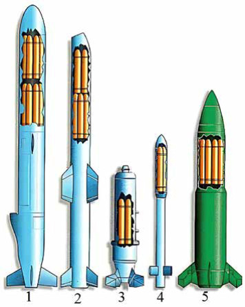 Возможные носители СНБЭ ВАТ: 1 − тактическая ракета M39A3 ATACMS Block II (несет 13 СНБЭ ВАТ); 2 − ракета РСЗО MLRS (2 СНБЭ ВАТ); 3 − подвесная кассетная бомба тактического назначения TMD SUU-64 (4 СНБЭ ВАТ); 4 − ракета большой дальности SLAM (6…8 СНБЭ ВАТ); 5 − крылатая ракета Tomahawk (12…16 СНБЭ ВАТ). Рисунок: mavink.com