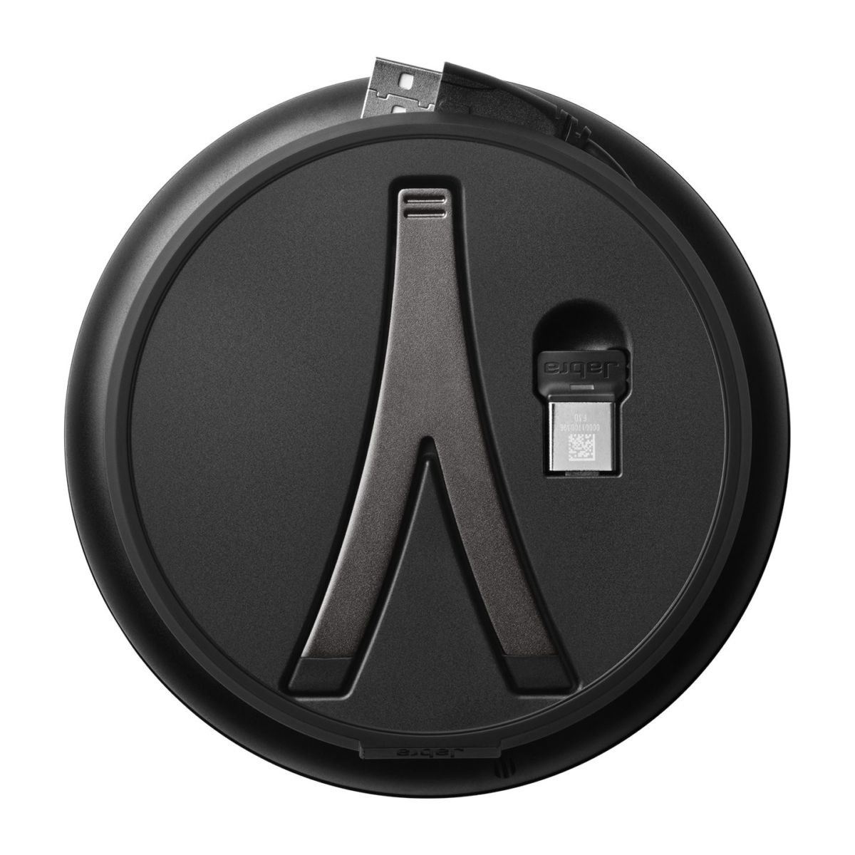 Под динамиком спрятан кабель USB 2.0 для проводного подключения спикерфона. Нам так и не удалось скрутить провод таким образом, чтобы штекер не выглядывал из-за колонки, но если смотреть на устройство сбоку, провод почти незаметен. Чтобы подключить модель к ПК по Bluetooth, можно использовать USB-адаптер, который крепится на задней части колонки. Здесь же есть удобная треугольная ножка, которая служит подставкой для Speak 710 в вертикальном положении.