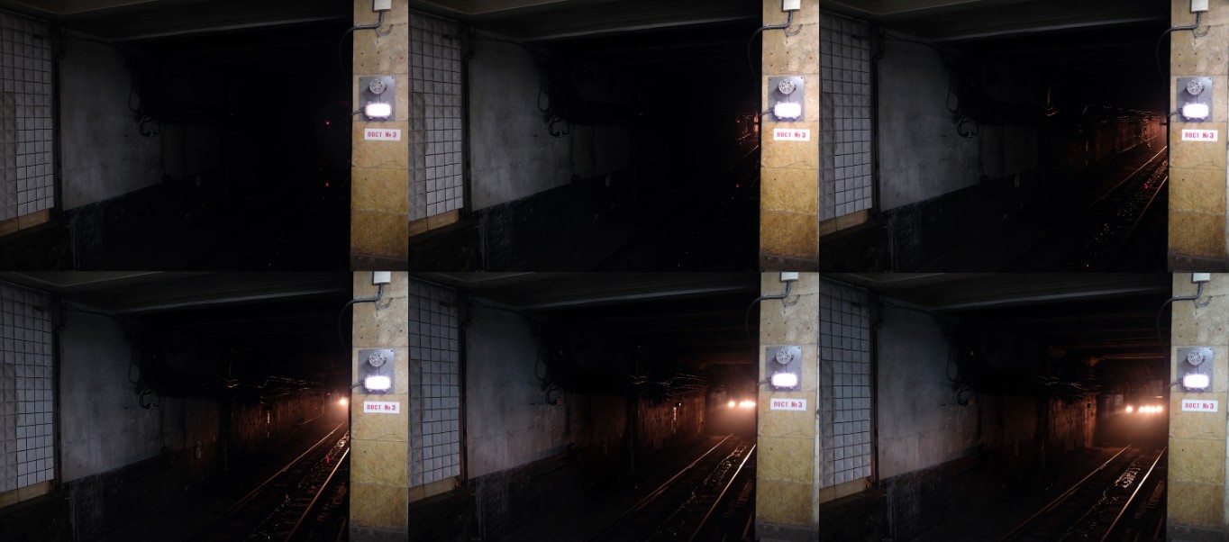 На Сокольнической линии Московского метрополитена именной состав «Красная стрела» выходит из тоннеля на станции метро «Лубянка».