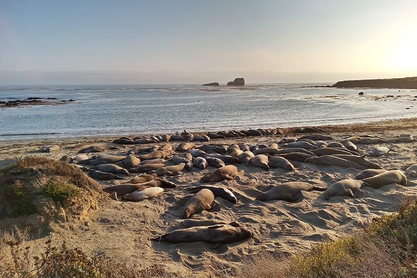 Я точно знаю, откуда пошла поговорка «лежать, как тюлень на пляже» — из Калифорнии! Здесь, на берегу Тихого океана, я обнаружила большую колонию морских слонов. Они расположились в ряд, подпирая друг друга тяжелыми боками. Время от времени подкидывают лапами-ластами песок, посыпая им себя: спасаются от жары. Некоторые находят в себе силы изредка переворачиваться. Единственный морской слон, которого я застала в движении, нырял недалеко от берега, издавая гортанные звуки. Громко. Грета в недоумении смотрела на это зрелище и не понимала, зачем лежать на песке. По песку надо бегать как сайгак, ловить крабиков и сбивать с ног хозяйку. Глупые тюлени.