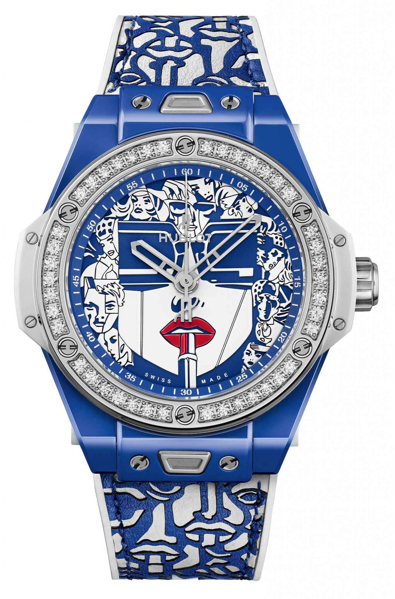 Коллекционировать можно не только картины, марки, редкие издания и проч. Мы фанаты часов Hublot и всегда рады их новым релизам, созданным в сотрудничестве с выдающимися художниками современности. Перед вами — та самая коллекционная вещь и настоящий предмет искусства, который можно носить на запястье! Hublot Big Bang One Click Marc Ferrero Ceramic Blue — часы, созданные в партнерстве с французским художником Марком Ферреро. Лимитированная версия выпущена в количестве всего 25 экземпляров! Надо сказать, что это уже не первая совместная работа художника и Hublot. За основу взята самая известная работа Марка — «Lipstick» («Помада») — настоящая ода многоликости женщины XXI века. Красные губы и большие солнцезащитные очки, волосы, в которых угадываются фрагменты лиц и фигур... Многочисленные лица есть сумма всех жизненных ролей