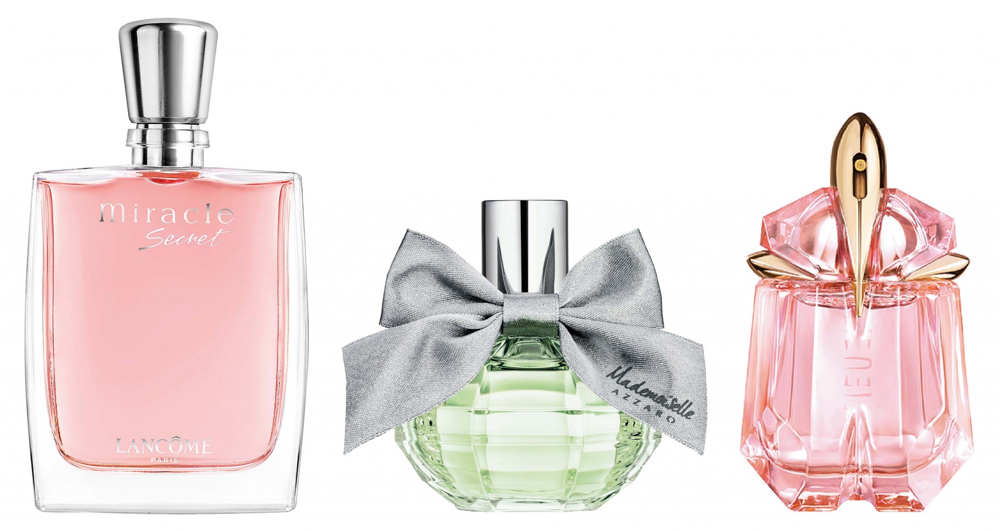 Слева направо: 1. Туалетная вода Miracle Secret, Lanc^ome. 2. Туалетная вода Mademoiselle Azzaro L’Eau Tres Florale, Azzaro. 3. Туалетная вода Alien Flora Futura, Mugler.
