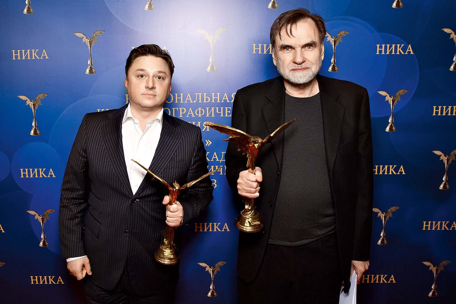Кстати, Сергею Сельянову в этот вечер еще не раз пришлось подниматься на сцену, отдуваясь за отсутствующих коллег — режиссера Бориса Хлебникова, актрису Ирину Горбачёву, сопродюсера Рубена Дишдишяна. А всё потому, что именно «Аритмия» стала настоящим триумфатором церемонии этого года. Статуэтки в виде богини победы с золотыми крыльями достались главным действующим лицам картины — уже упомянутой Ирине Горбачёвой («Лучшая женская роль») и Александру Яценко («Лучшая мужская роль»). Зал скандировал их имена еще до оглашения реАктер Максим Лагашкин и продюсер Сергей Сельянов с наградами за фильм «Аритмия» зультатов голосования и решение академиков встретил бурными аплодисментами. Яценко получил награду из рук актрисы Татьяны Лютаевой. Он был немногословен: «Спасибо моей партнерше Ирине Горбачёвой. Я счастливый человек, и я вас люблю. Всё!»
