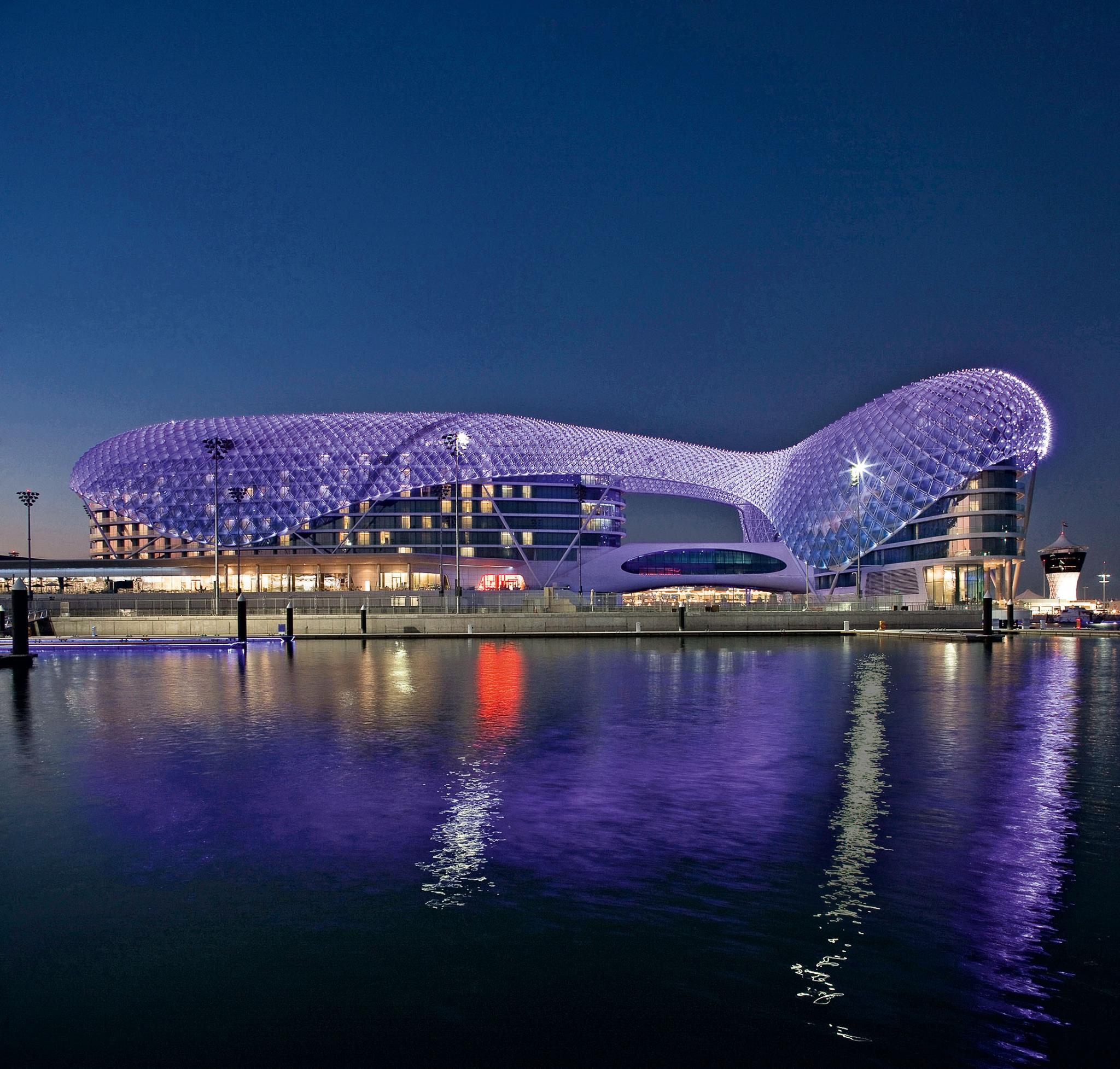 Дизайн отеля и номеров. Купол отеля представляет собой стеклянную конструкцию изогнутой формы, меняющую подсветку каждый вечер. Создается впечатление, что здание сверкает словно бриллиант. Yas Viceroy Abu Dhabi можно назвать дизайнерским отелем не только из-за его оригинального экстерьера, но и благодаря удивительному оформлению номеров, окна которых выходят на гостиничную территорию или на яхт-клуб. Самый шикарный по масштабам и оформлению Presidential Suite располагает собственной открытой террасой, спальней, гостиной, а также персональным бассейном и лифтом.
