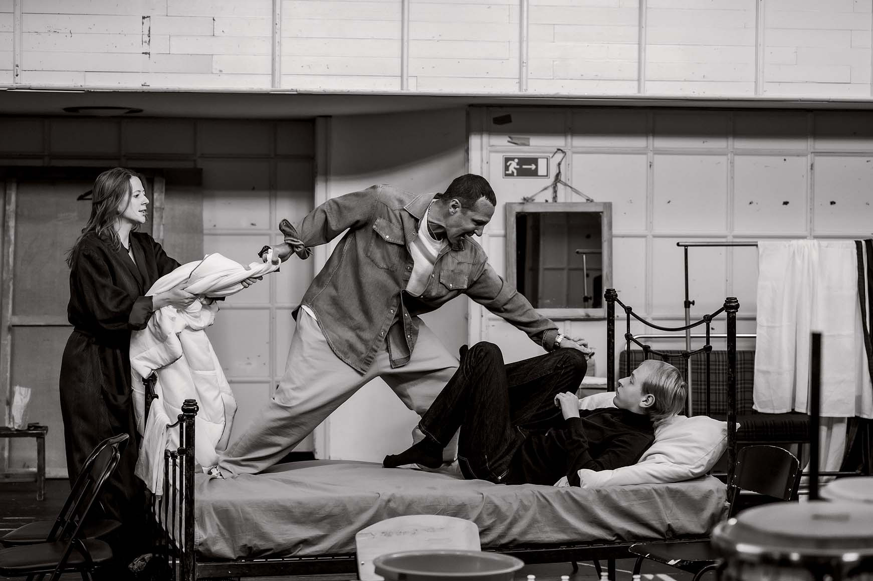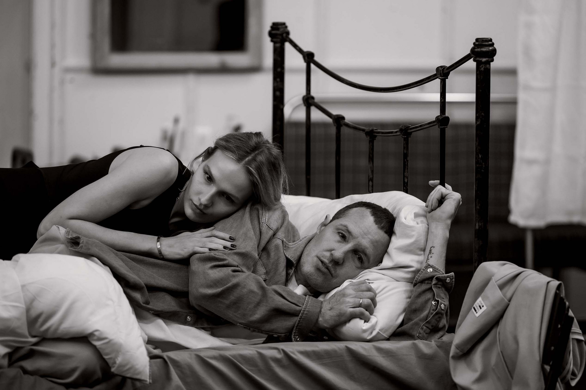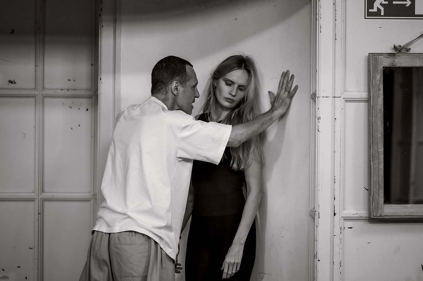 У спектаклей Петра Шерешевского есть особенность: он пишет собственную историю поверх классического произведения, и известный сюжет становится близким, будто он про нас. Есть у него и любимые приемы: игру актеров можно наблюдать одновременно и на сцене, и на экране. Вот и сейчас пространство репетиционного зала поделено на две зоны. В одной — выгородка: обеденный стол и несколько стульев, в стороне застеленная кровать. Вторая зона — вокруг режиссерского столика: там размещено три монитора. На эти мониторы транслируется видео с трех камер, которые стоят в углах зала. Получается своего рода двойная партитура: Пётр Шерешевский одновременно репетирует с актерами и