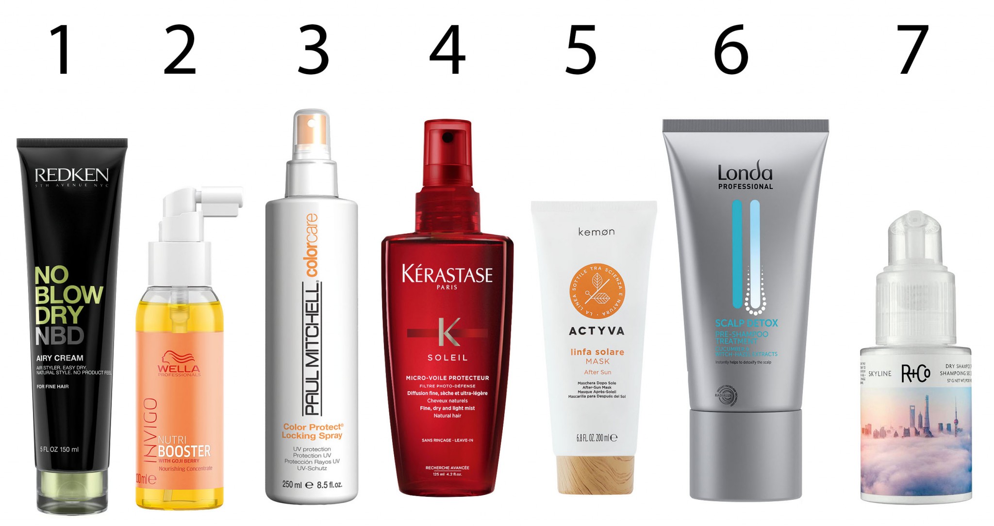 Уход за волосами. 1. Крем-стайлинг для укладки без фена No Blow Dry NBD Airy Cream, Redken. 2. Питательный бустер-концентрат Nutri Booster, Invigo, Wella Professionals. 3. Солнцезащитный спрей для волос Color Protect Locking Spray, Paul Mitchell. 4. Защитный спрей-вуаль Micro-Voile Protecteur, K´erastase. 5. Маска для волос после солнца Actyva, Kemon. 6. Очищающая эмульсия Scalp Detox Pre-Shampoo Treatment, Londa Professional. 7. Сухой шампунь Skyline Dry Shampoo Powder, R+Co.