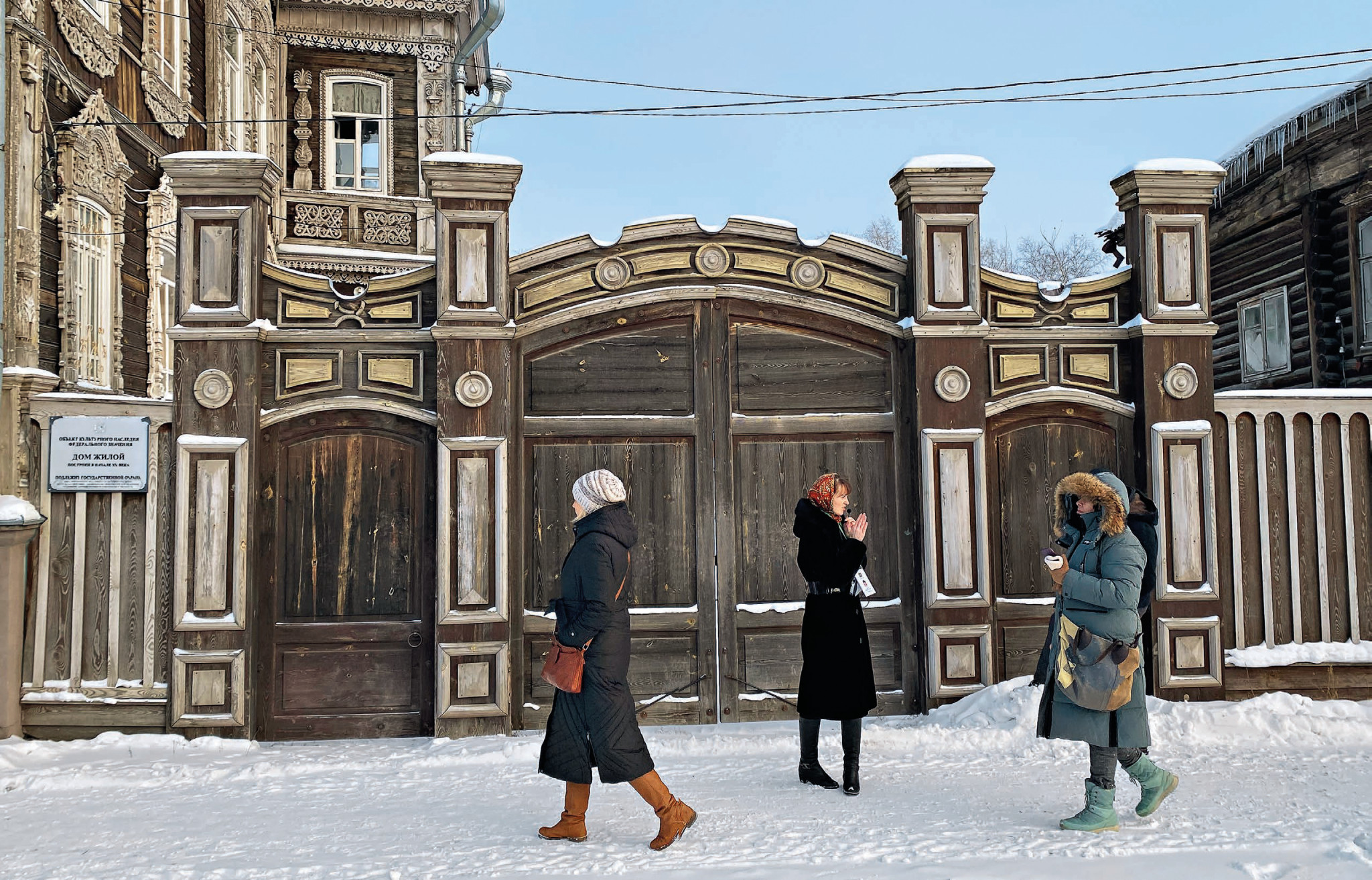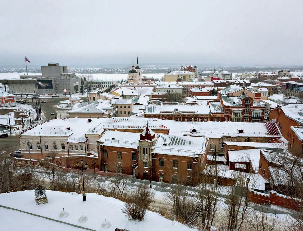 По булыжной мостовой поднимаемся на Воскресенскую гору. С нее открывается замечательный вид на Томск. Деревянные дома с шапками снега на крышах и тонкими струйками печного дыма словно сошли с новогодних открыток и сверху кажутся игрушечными. Солнечные лучи, пробиваясь сквозь морозный туман, погружают город в оранжево-розовые тона и придают ему сказочный вид.