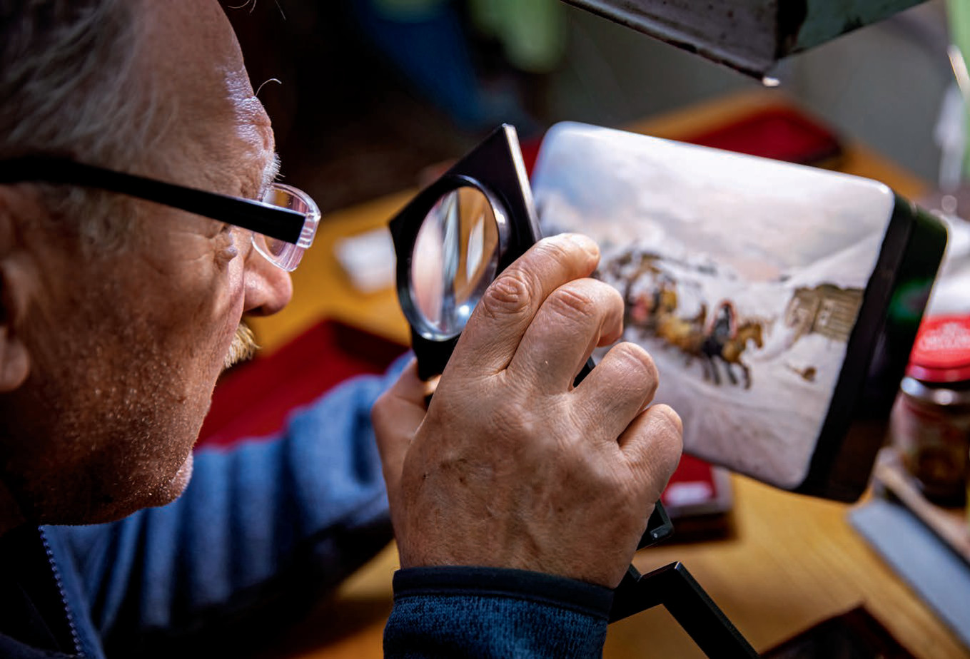 Каждое изделие создается вручную, проходя множество этапов: от лепки папье-маше до многослойной росписи. Работа над каждой шкатулкой занимает от 3 до 6 месяцев. Особенность миниатюры – использование масляных красок и техники письма по сквозному просвету, что придает изображению объем и свечение.