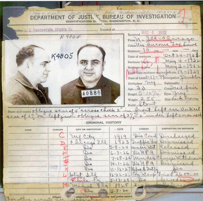 Капоне успел пожить и опасно, и красиво, но все же оказался в тюрьме на острове Алькатрас (внизу — фото и записи из личного дела, 1939 год). Похоронен в штате Иллинойс, США.