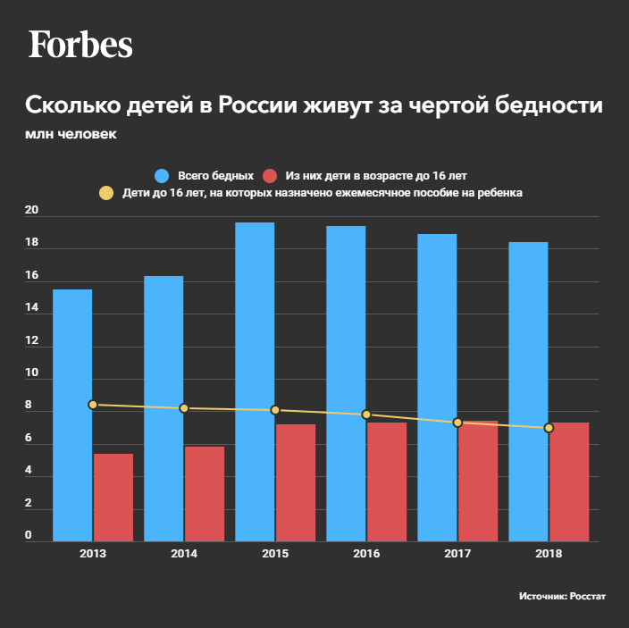 О том, что до нуждающихся семей с детьми доходит лишь небольшая доля средств, выделяемых на их поддержку, в 2017 году сообщали в совместном докладе Всемирный банк и Научно-исследовательский финансовый институт. По их оценке, от 63% до 79% общих сумм пособий и выплат нуждающимся семьям с детьми в 2015 году достались «небедным» россиянам. По данным Росстата за 2019 год, регионы выделили на поддержку семей с детьми 153,6 млрд рублей. Из этой суммы бедные семьи получили лишь 28%. Нуждающиеся представляют большинство лишь в группе получателей продовольственной помощи. Им также достается значимая доля средств, выделяемых на санаторно-курортное лечение и международные перевозки. Что касается денежной выплаты семьям с детьми, тут до бедных доходит менее трети общей суммы.