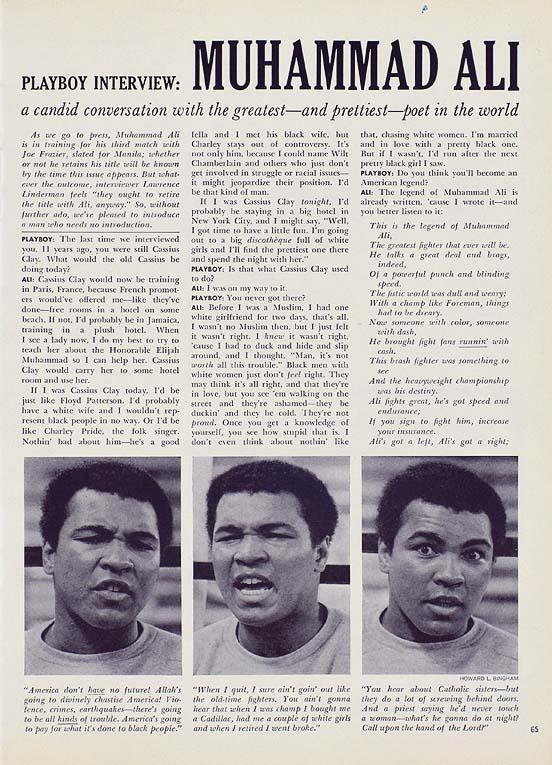 Пока мы готовили этот номер к печати, этот мир покинул один из величайших боксеров в истории. Чемпион долго держал удар – 32 года он жил с болезнью Паркинсона, несомненно, последствием яркой жизни в ринге, – но, очевидно, устал. Это интервью было сделано незадолго до третьего боя с самым принципиальным соперником Али, Джо Фрейзером. В нем Мохаммед восхвалял стихи собственного сочинения, ислам и заодно рассказал, каким был бы, останься он Кассиусом Клеем