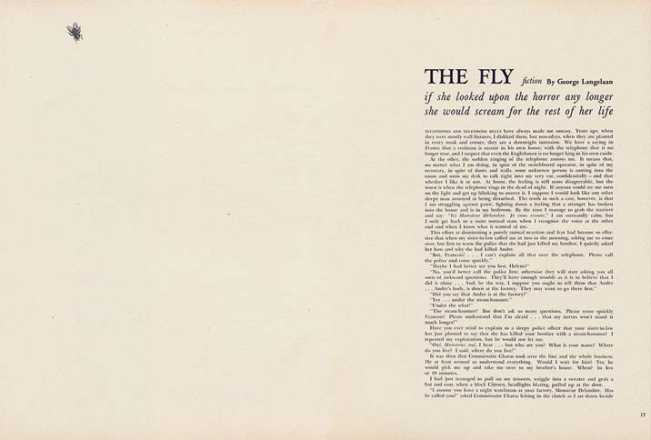 В научно-фантастическом рассказе «Муха» (выпуск – июнь 1957 года) британский автор французского происхождения Жорж Ланжелан знакомит читателей с ученым, который случайно смешивает свои гены с генами мухи обыкновенной и мутирует в гибрид человека и насекомого. Тревога рассказчика в связи с новыми технологиями, правительственной секретностью и своим превращением, скорее всего, является отражением тревог самого автора: будучи шпионом во время второй мировой войны, Ланжелан перенес пластическую операцию, которая сделала его лицо менее узнаваемым.