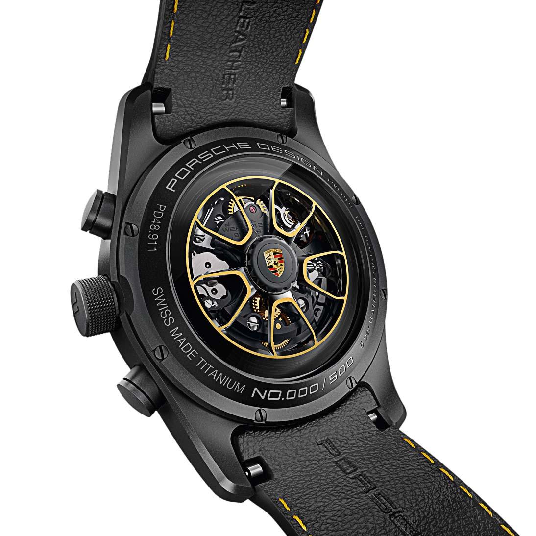 Каждый покупатель спецверсии 911-го В может заказать себе хронограф, который приведут в соответствие со спецификацией заказанного автомобиля. Корпус – из титана, циферблат – из карбона, частично окрашенного в цвет автомобиля. Механизм разработки Porsche Design